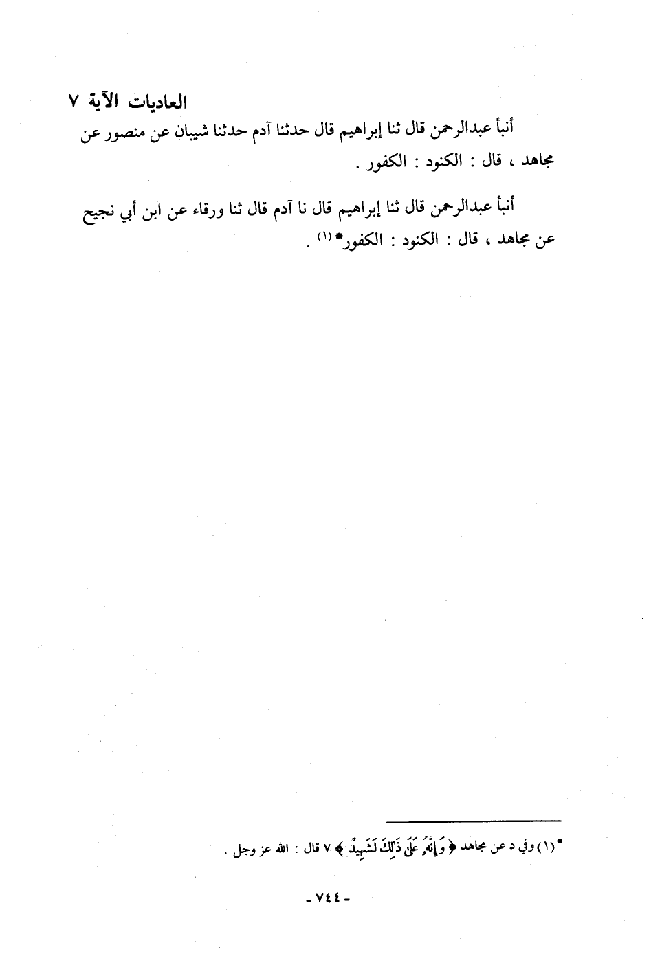 أنبأ عَبْدُ الرَّحْمَنِ، قَالَ: ثنا إِبْرَاهِيمُ، قَالَ: حَدَّثَنَا آدَمُ، قَالَ: حَدَّثَنَا شَيْبَانُ، عَنْ مَنْصُورٍ، عَنْ مُجَاهِدٍ، قَالَ: " §الْكَنُودُ: الْكَفُورُ "
