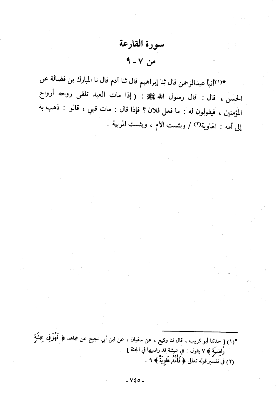 أنبأ عَبْدُ الرَّحْمَنِ، قَالَ: ثنا إِبْرَاهِيمُ، قَالَ: ثنا آدَمُ، قَالَ: نا الْمُبَارَكُ بْنُ فَضَالَةَ، عَنِ الْحَسَنِ، قَالَ: قَالَ رَسُولُ اللَّهِ صَلَّى اللَّهُ عَلَيْهِ وَسَلَّمَ: " §إِذَا مَاتَ الْعَبْدُ تَلْقَى رُوحُهُ أَرْوَاحَ الْمُؤْمِنِينَ، فَيَقُولُونَ لَهُ: مَا فَعَلَ فُلَانٌ، فَإِذَا قَالَ: مَاتَ قَبْلِي، قَالُوا: ذُهِبَ بِهِ إِلَى أُمِّهِ الْهَاوِيَةِ، وَبِئْسَتِ الْأُمُّ، وَبِئْسَتِ الْمُرَبِّيَةِ "