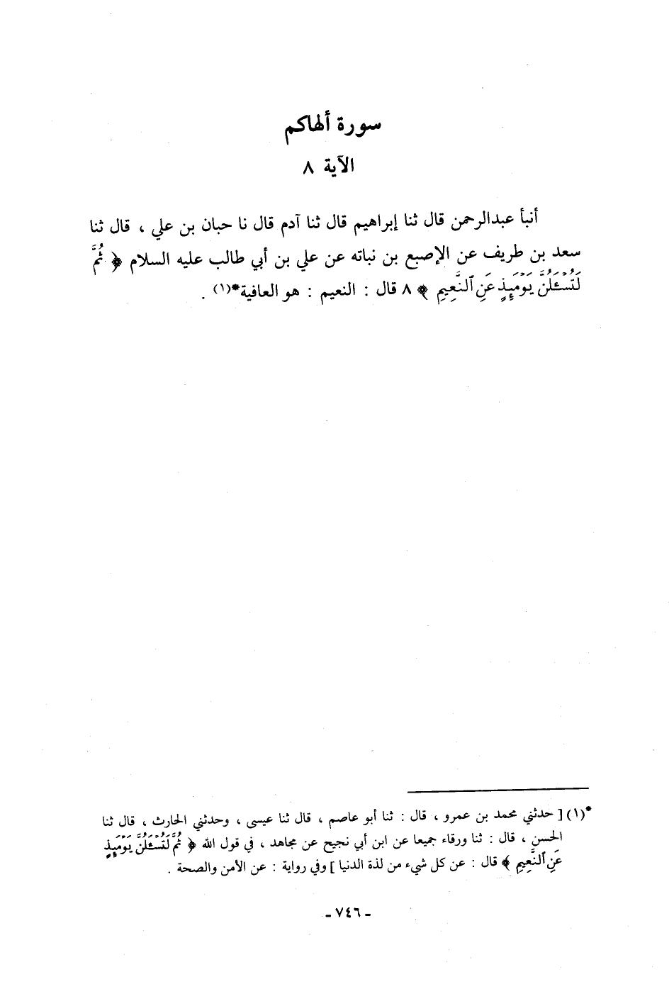 أنبأ عَبْدُ الرَّحْمَنِ، قَالَ: ثنا إِبْرَاهِيمُ، قَالَ: ثنا آدَمُ، قَالَ: نا حَبَّانُ بْنُ عَلِيٍّ، قَالَ: ثنا سَعْدُ بْنُ طَرِيفٍ، عَنِ الْإِصْبَعِ بْنِ نُبَاتَةَ، عَنْ عَلِيِّ بْنِ أَبِي طَالِبٍ عَلَيْهِ السَّلَامُ: {§ثُمَّ لَتُسْأَلُنَّ يَوْمَئِذٍ عَنِ النَّعِيمِ} [التكاثر: 8] قَالَ: " النَّعِيمُ: هُوَ الْعَافِيَةُ "