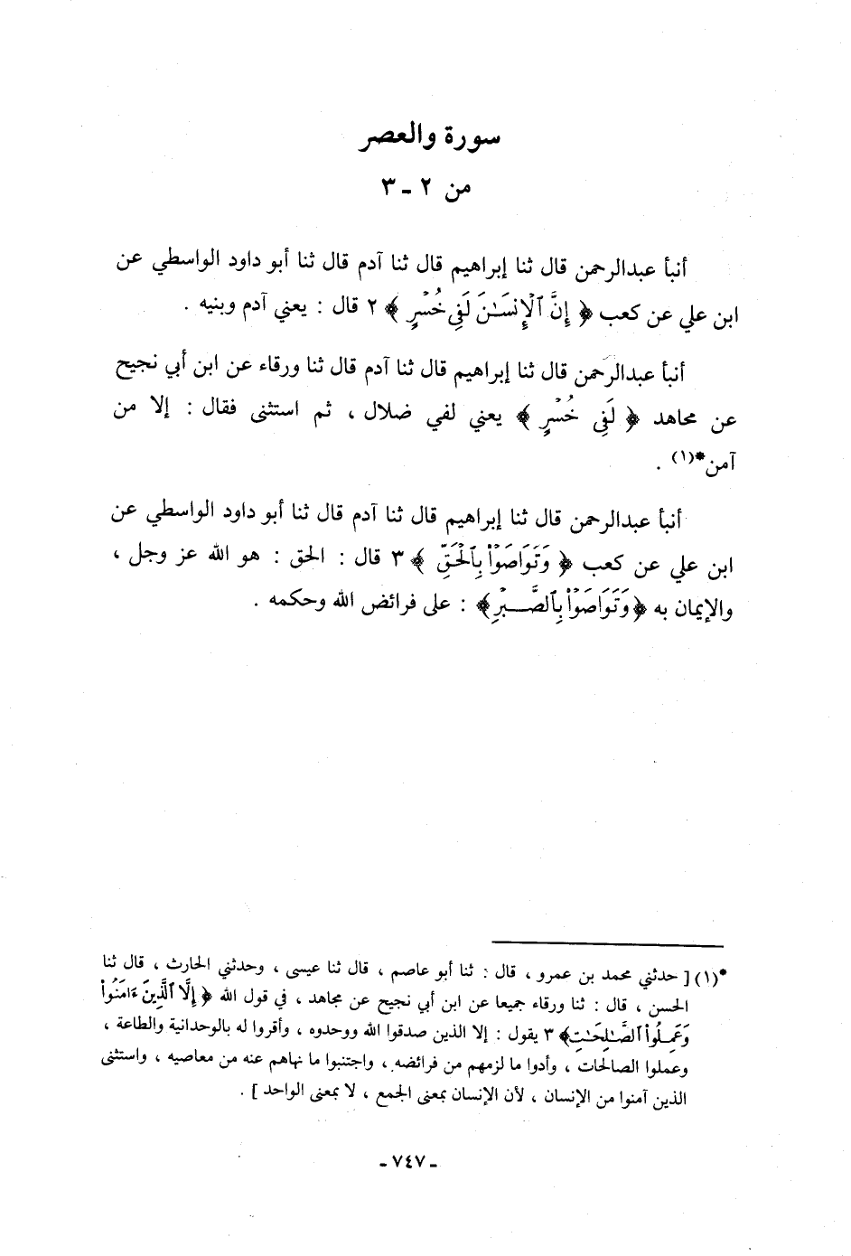 أنبأ عَبْدُ الرَّحْمَنِ، قَالَ: ثنا إِبْرَاهِيمُ، قَالَ: ثنا آدَمُ، قَالَ: ثنا أَبُو دَاوُدَ الْوَاسِطِيُّ، عَنِ ابْنِ عَلِيٍّ، عَنْ كَعْبٍ: {§إِنَّ الْإِنْسَانَ لَفِي خُسْرٍ} [العصر: 2] قَالَ: «يَعْنِي آدَمَ وَبَنِيهِ»