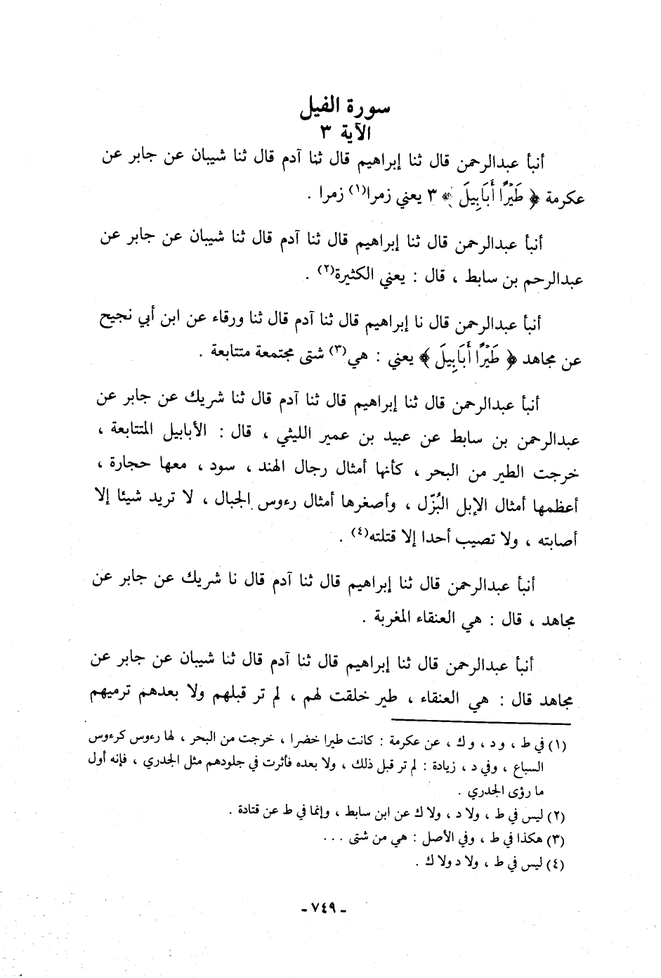 أنبأ عَبْدُ الرَّحْمَنِ، قَالَ: ثنا إِبْرَاهِيمُ، قَالَ: ثنا آدَمُ، قَالَ: ثنا شَرِيكٌ، عَنْ جَابِرٍ، عَنْ عَبْدِ الرَّحْمَنِ بْنِ سَابِطٍ، عَنْ عُبَيْدِ بْنِ عُمَيْرٍ اللَّيْثِيِّ، قَالَ: " §الْأَبَابِيلُ: الْمُتَتَابِعَةُ، خَرَجَتِ الطَّيْرُ مِنَ الْبَحْرِ كَأَنَّهَا أَمْثَالُ رِجَالِ الْهِنْدِ، سُودٌ مَعَهَا حِجَارَةٌ أَعْظَمُهَا أَمْثَالُ الْإِبِلِ الْبُزَّلِ، وَأَصْغَرُهَا أَمْثَالُ رُءُوسِ الرِّجَالِ، لَا تُرِيدُ شَيْئًا إِلَّا أَصَابَتْهُ، وَلَا تُصِيبُ أَحَدًا إِلَّا قَتَلَتْهُ ". أنبأ عَبْدُ الرَّحْمَنِ، قَالَ: ثنا إِبْرَاهِيمُ، قَالَ: ثنا آدَمُ، قَالَ: نا شَرِيكٌ، عَنْ جَابِرٍ، عَنْ مُجَاهِدٍ، قَالَ: «هِيَ الْعَنْقَاءُ الْمُغْرِبَةُ»