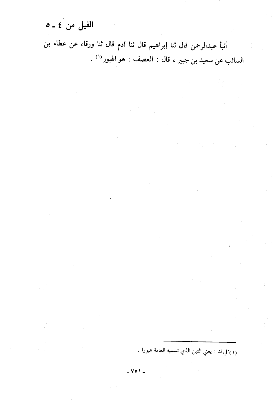 أنبأ عَبْدُ الرَّحْمَنِ، قَالَ: ثنا إِبْرَاهِيمُ، قَالَ: ثنا آدَمُ، قَالَ: ثنا وَرْقَاءُ، عَنْ عَطَاءِ بْنِ السَّائِبِ، عَنْ سَعِيدِ بْنِ جُبَيْرٍ، قَالَ: " §الْعَصْفُ: هُوَ الْهَبُّورُ "