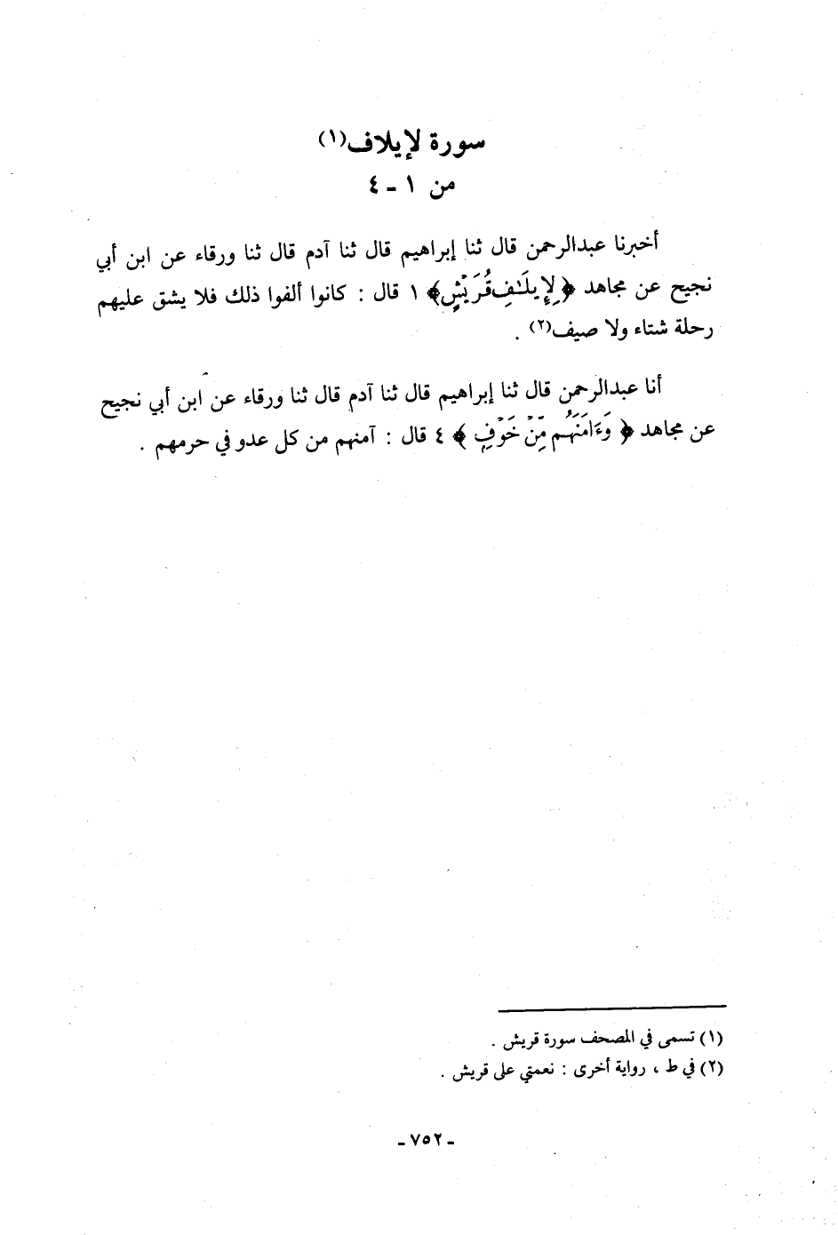 أَخْبَرَنَا عَبْدُ الرَّحْمَنِ، قَالَ: ثنا إِبْرَاهِيمُ، قَالَ: ثنا آدَمُ، قَالَ: ثنا وَرْقَاءُ، عَنِ ابْنِ أَبِي نَجِيحٍ، عَنْ مُجَاهِدٍ: {لِإِيلَافِ قُرَيْشٍ} [قريش: 1] قَالَ: «كَانُوا §أَلِفُوا ذَلِكَ فَلَا يَشُقُّ عَلَيْهِمْ رِحْلَةُ شِتَاءٍ وَلَا صَيْفٍ»