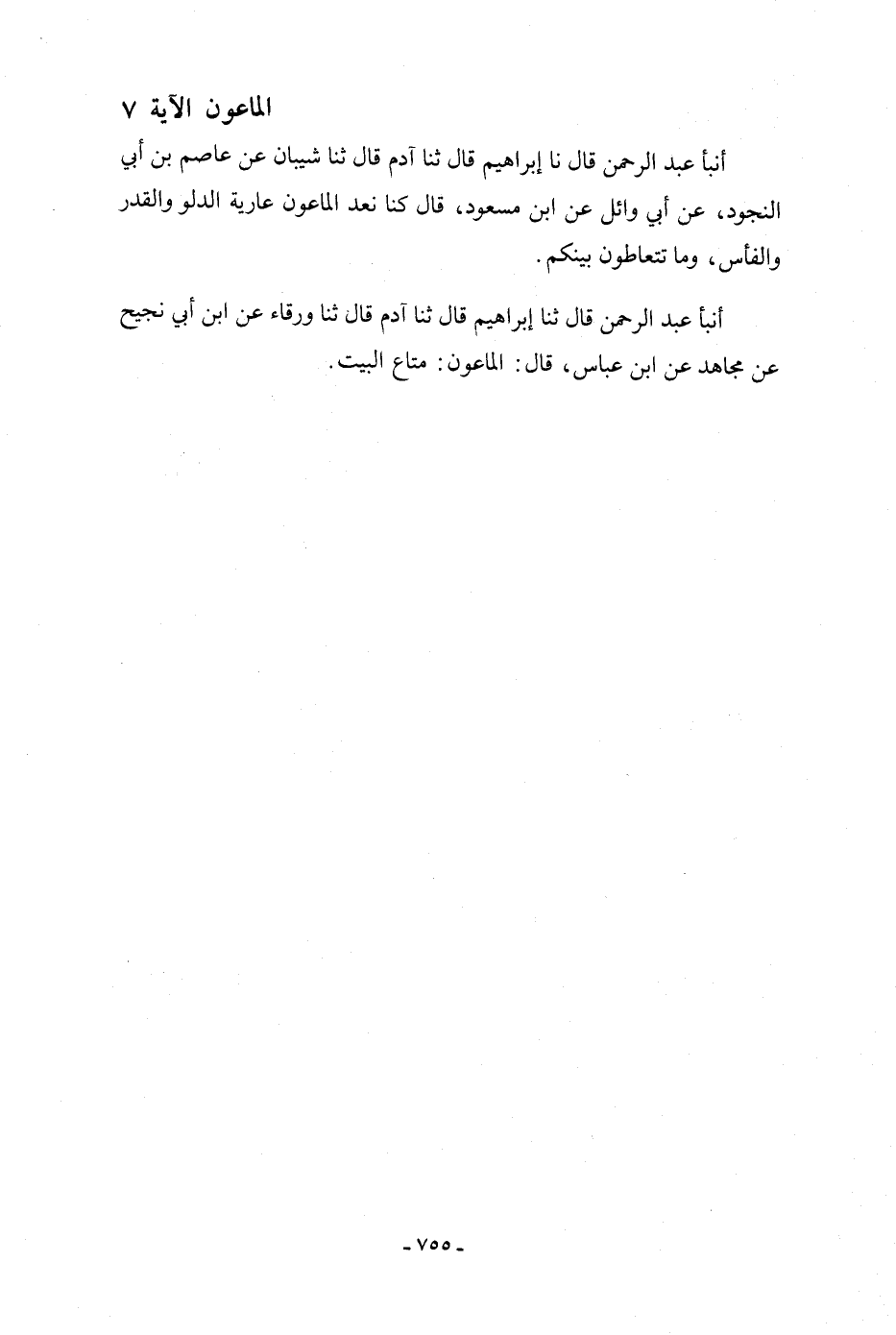 أنبأ عَبْدُ الرَّحْمَنِ، قَالَ: نا إِبْرَاهِيمُ، قَالَ: ثنا آدَمُ، قَالَ: ثنا شَيْبَانُ، عَنْ عَاصِمِ بْنِ أَبِي النَّجُودِ، عَنْ أَبِي وَائِلٍ، عَنِ ابْنِ مَسْعُودٍ، قَالَ: «§كُنَّا نَعُدُّ الْمَاعُونَ عَارِيَةً الدَّلْوَ وَالْقِدْرَ وَالْفَأْسَ وَمَا تَتَعَاطُونَ بَيْنَكُمْ» . أنبأ عَبْدُ الرَّحْمَنِ، قَالَ: ثنا إِبْرَاهِيمُ، قَالَ: ثنا آدَمُ، قَالَ: ثنا وَرْقَاءُ، عَنِ ابْنِ أَبِي نَجِيحٍ، عَنْ مُجَاهِدٍ، عَنِ ابْنِ عَبَّاسٍ، قَالَ: " الْمَاعُونُ: مَتَاعُ الْبَيْتِ "