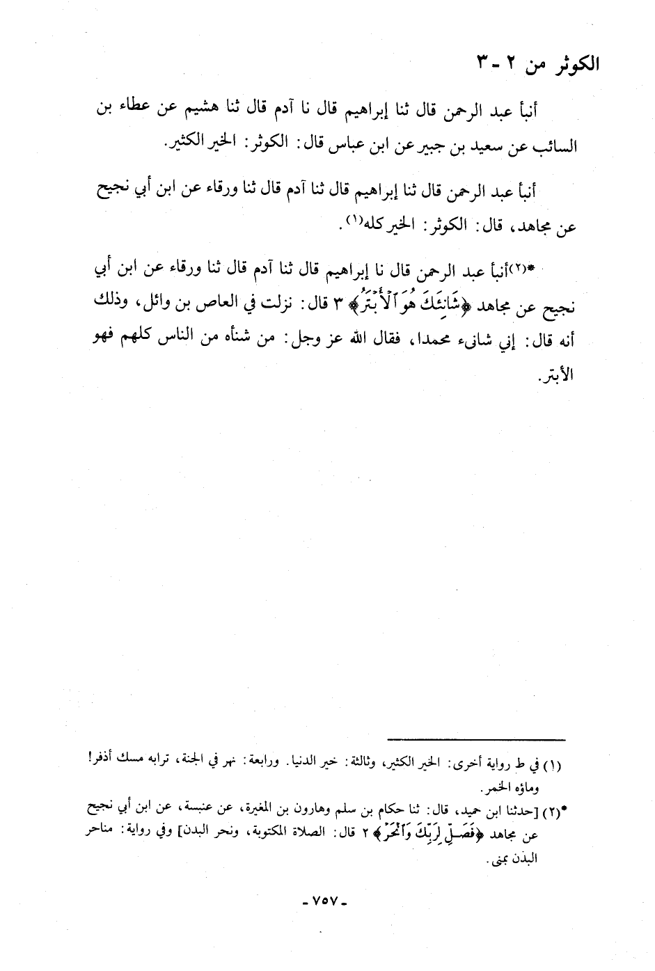 أنبأ عَبْدُ الرَّحْمَنِ، قَالَ: ثنا إِبْرَاهِيمُ، قَالَ: ثنا آدَمُ، قَالَ: ثنا وَرْقَاءُ، عَنِ ابْنِ أَبِي نَجِيحٍ، عَنْ مُجَاهِدٍ، قَالَ: " §الْكَوْثَرُ: الْخَيْرُ كُلُّهُ "