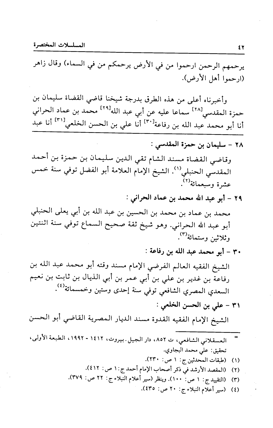 وَأَخْبَرَنَاهُ أَعْلَى مِنْ هَذِهِ الطُّرُقِ بِدَرَجَةٍ شَيْخُنَا قَاضِي الْقُضَاةِ أَبُو الْفَضْلِ سُلَيْمَانُ بْنُ حَمْزَةَ الْمَقْدِسِيُّ سَمَاعًا عَلَيْهِ، عَنْ أَبِي عَبْدِ اللَّهِ مُحَمَّدِ بْنِ عِمَادٍ الْحَرَّانِيِّ، أنا أَبُو مُحَمَّدٍ عَبْدُ اللَّهِ بْنُ رِفَاعَةَ، أنا عَلِيُّ بْنُ الْحَسَنِ الْخِلَعِيُّ، أنا عَبْدُ