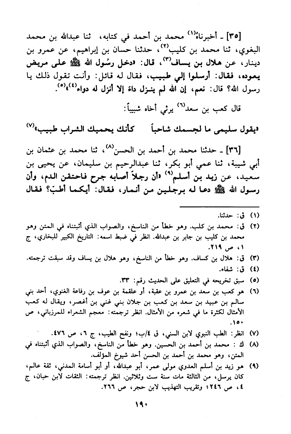 35- أخبرناه محمد بن أحمد في كتابه، حَدَّثَنا عبد الله بن محمد البغوي، حَدَّثَنا محمد بن كليب حَدَّثَنا حسان بن إبراهيم، عَن عَمْرو بن دينار، عَن هلال بن يساف قال: دخل رسول الله صَلَّى الله عَليْهِ وَسلَّم على مريض يعوده فقال: أرسلوا إلى طبيب فقال له قائل: وأنت تقول ذلك يا رسول الله؟ قال: نعم إن الله لم ينزل داء إلا أنزل له دواء.