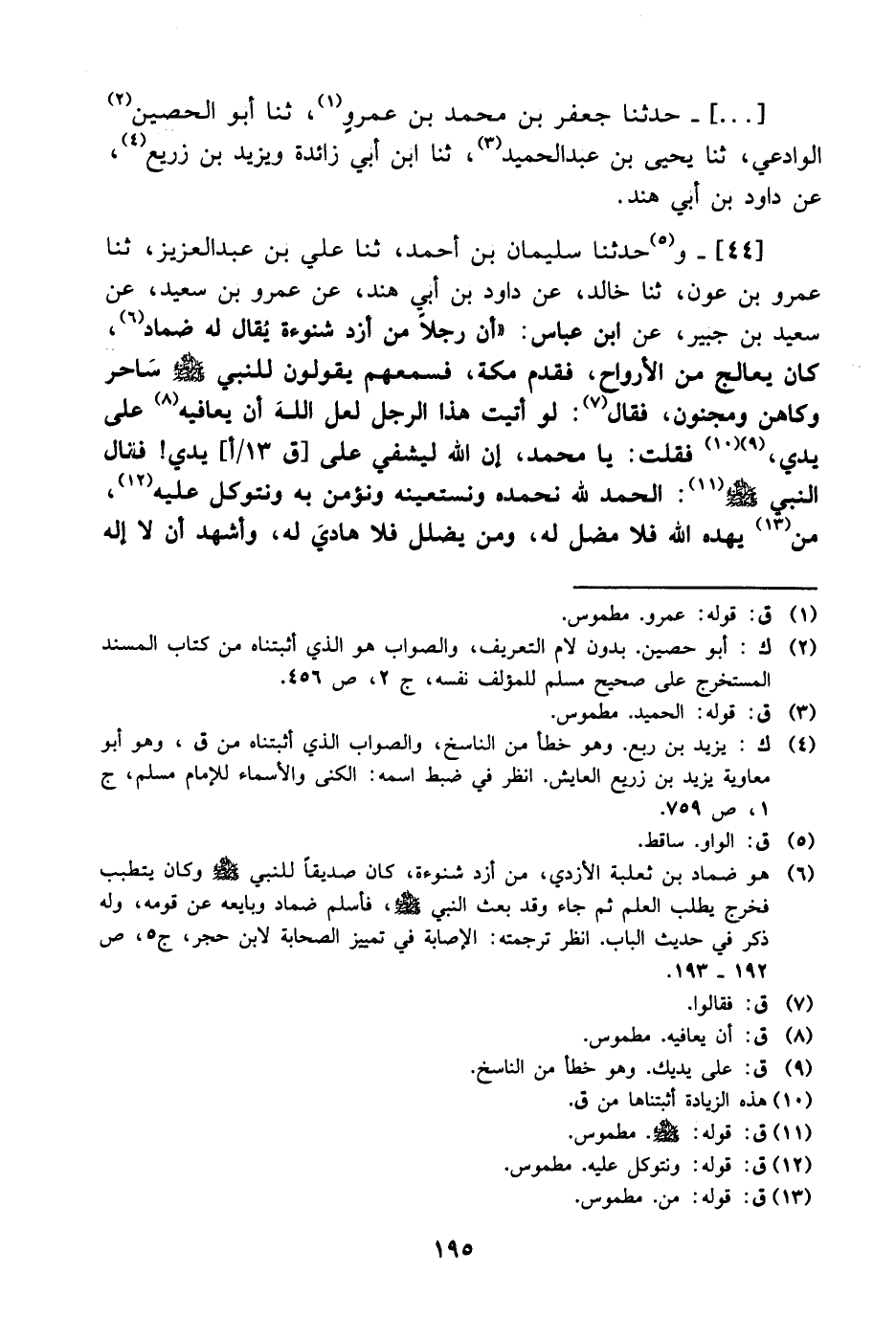 [..] وَحَدَّثنا سليمان بن أحمد، حَدَّثَنا علي بن عبد العزيز، حَدَّثَنا عَمْرو بن عون، حَدَّثَنا خالد، عَن داود بن أبي هند، عَن عَمْرو بن سعيد، عَن سعيد بن جبير، عَن ابن عباس: أن رجلا من أزد شنوءة يقال له ضماد كان يعالج من الأرواح فقدم مكة فسمعهم يقولون للنبي صَلَّى الله عَليْهِ وَسلَّم ساحر وكاهن ومجنون فقال: لو أتيت هذا الرجل لعل الله أن يعافيه على يدي فقلت: يامحمد إن الله ليشفي على يدي! فقال النبي صَلَّى الله عَليْهِ وَسلَّم: الحمد لله نحمده ونستعينه ونؤمن به ونتوكل عليه من يهده الله فلا مضل له ومن يضلل فلا هادي له وأشهد ان لا إله -[196]- إلا الله وحده لا شريك له وأن محمدا عبده ورسوله أما بعد..، فقال: أعد علي قولك! فأعاد النبي صَلَّى الله عَليْهِ وَسلَّم قوله ثلاثا فقال: والله لقد سمعت قول الكهنة وسمعت قول السحرة وسمعت قول الشعراء فما سمعت مثل هؤلاء الكلمات ولقد بلغن قاموس البحر فمد يدك فبايعني فمد النبي صَلَّى الله عَليْهِ وَسلَّم يده فبايعه فقال النبي صَلَّى الله عَليْهِ وَسلَّم: وعلى قومك فقال: وعلى قومي.