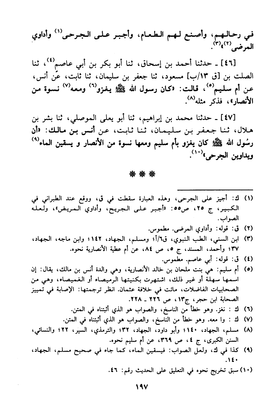 47- حَدَّثَنا محمد بن إبراهيم، حَدَّثَنا أبو يعلى الموصلي، حَدَّثَنا بشر بن هلال، حَدَّثَنا جعفر بن سليمان، حَدَّثَنا ثابت، عَن أنس بن مالك: أن رسول الله صَلَّى الله عَليْهِ وَسلَّم كان يغزو بأم سليم ومعها نسوة من الأنصار ويسقين الماء ويداوين الجرحى.