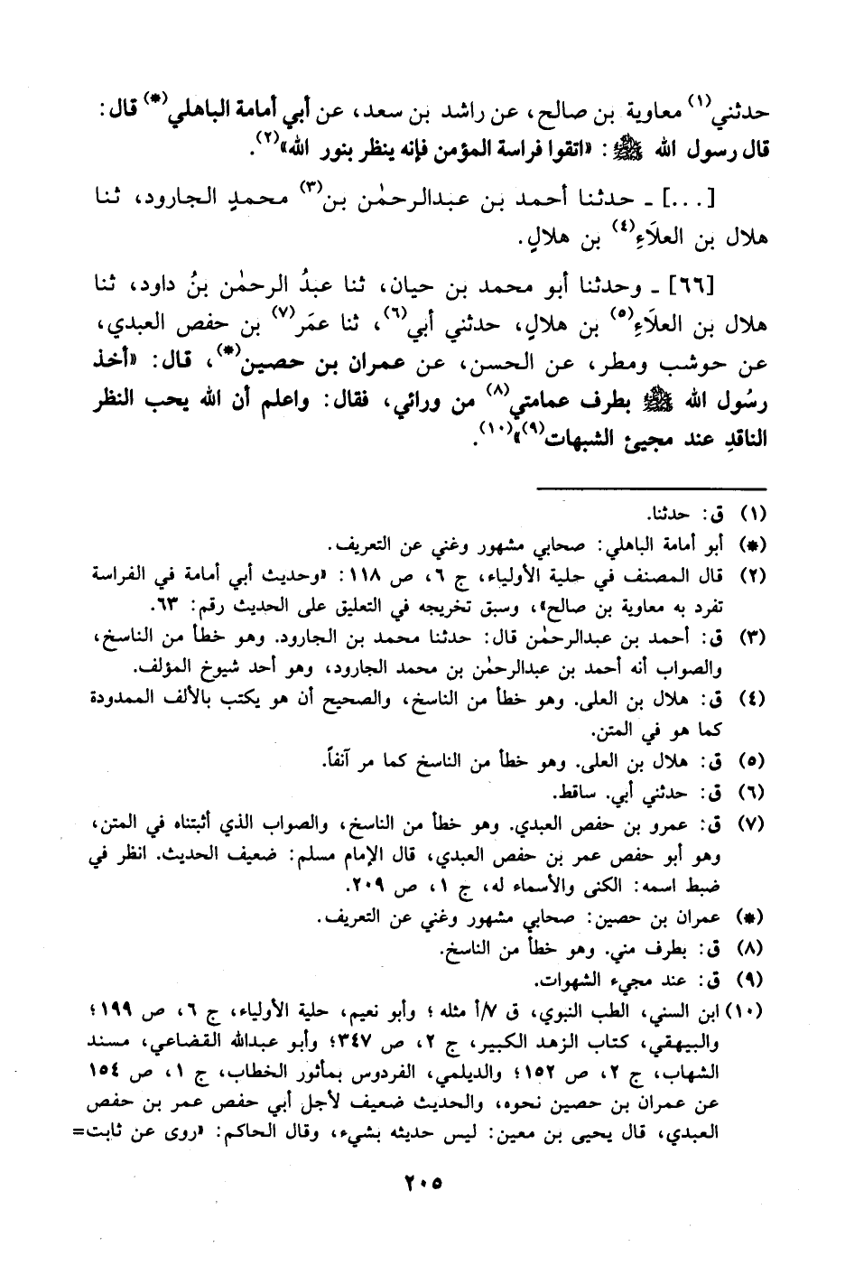 [..] وَحَدَّثنا أبو محمد بن حيان، حَدَّثَنا عبد الرحمن بن داود، حَدَّثَنا هلال بن العلاء بن هلال حدثني أبي، حَدَّثَنا عُمَر بن حفص العبدي، عَن حوشب ومطر، عَن الحسن، عَن عمران بن حصين قال: أخذ رسول الله صَلَّى الله عَليْهِ وَسلَّم بطرف عمامتي من ورائي فقال: واعلم أن الله يحب النظر الناقد عند مجيئ الشبهات.