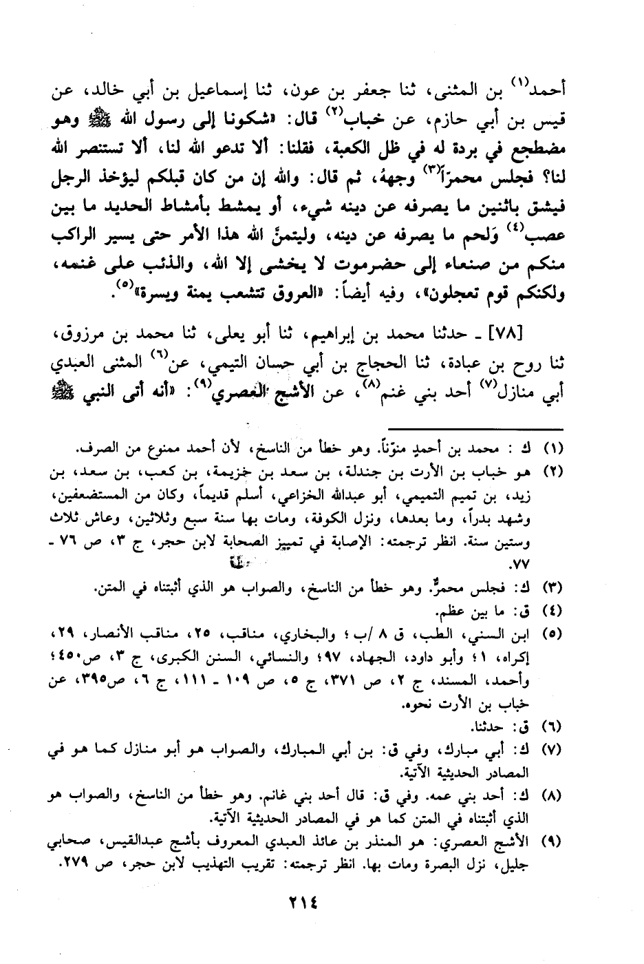 78- حَدَّثَنا محمد بن إبراهيم، حَدَّثَنا أبو يعلى، حَدَّثَنا محمد بن مرزوق، حَدَّثَنا روح بن عبادة، حَدَّثَنا الحجاج بن أبي حسان التيمي، عَن المثنى العبدي أبي منازل أحد بني غنم، عَن الأشج العصري: أنه أتى النبي صَلَّى الله عَليْهِ وَسلَّم -[215]- في وفد عبد القيس قال: فقال النبي صَلَّى الله عَليْهِ وَسلَّم: إن الظروف لا تحل شيئا ولا تحرم ولكن كل مسكر حرام يجلسون ويشربون حتى إذا ثملت العروق تفاخرتم فوثب الرجل على ابن عمه فضربه بالسيف فتركه أعرج قال: وهو يومئذ في القوم الأعرج الذي أصابه ذلك.