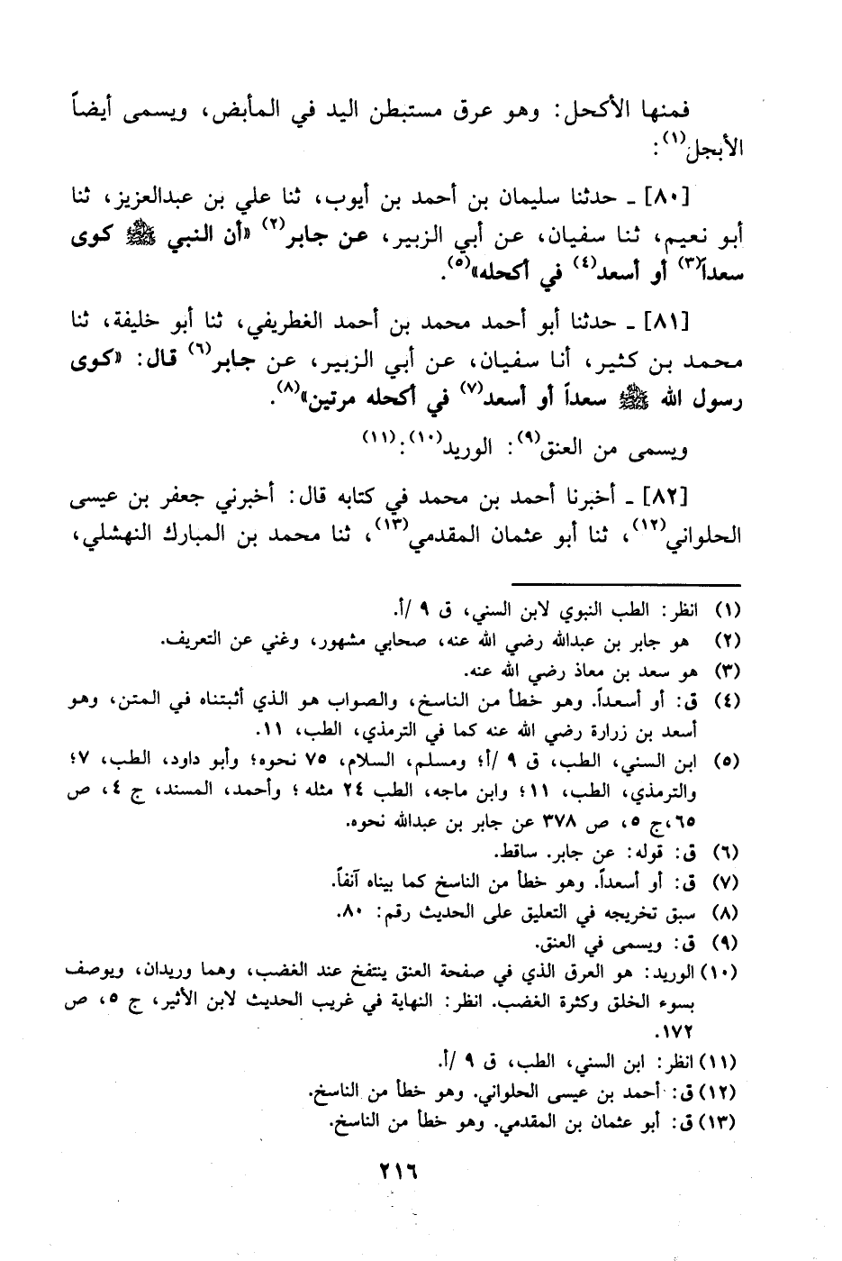81- حَدَّثَنا أبو أحمد محمد بن أحمد الغطريفي، حَدَّثَنا أبو خليفة، حَدَّثَنا محمد بن كثير، أَخْبَرنا سفيان، عَن أَبِي الزبير، عَن جابر قال: كوى رسول الله صَلَّى الله عَليْهِ وَسلَّم سعدا، أَو أسعد في أكحله مرتين.