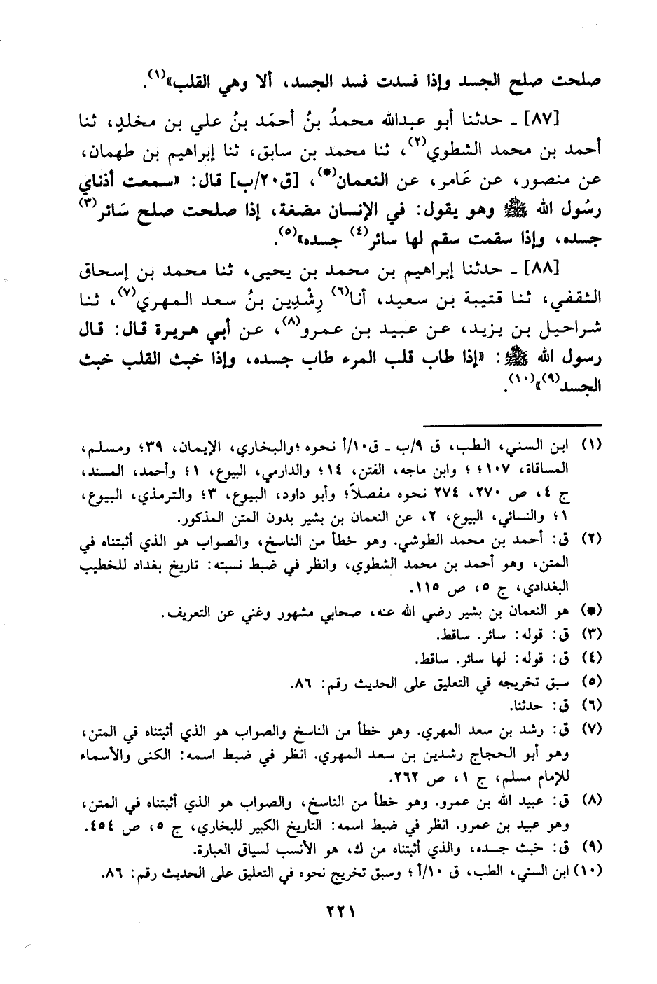 87- حَدَّثَنا أبو عبد الله محمد بن أحمد بن علي بن مخلد، حَدَّثَنا أحمد بن محمد الشطوي، حَدَّثَنا محمد بن سابق، حَدَّثَنا إبراهيم بن طهمان، عَن منصور، عَن عامر، عَن النعمان قال: سمعت أذناي رسول الله صَلَّى الله عَليْهِ وَسلَّم وهو يقول: في الإنسان مضغة إذا صلحت صلح سائر جسده وإذا سقمت سقم لها سائر جسده.