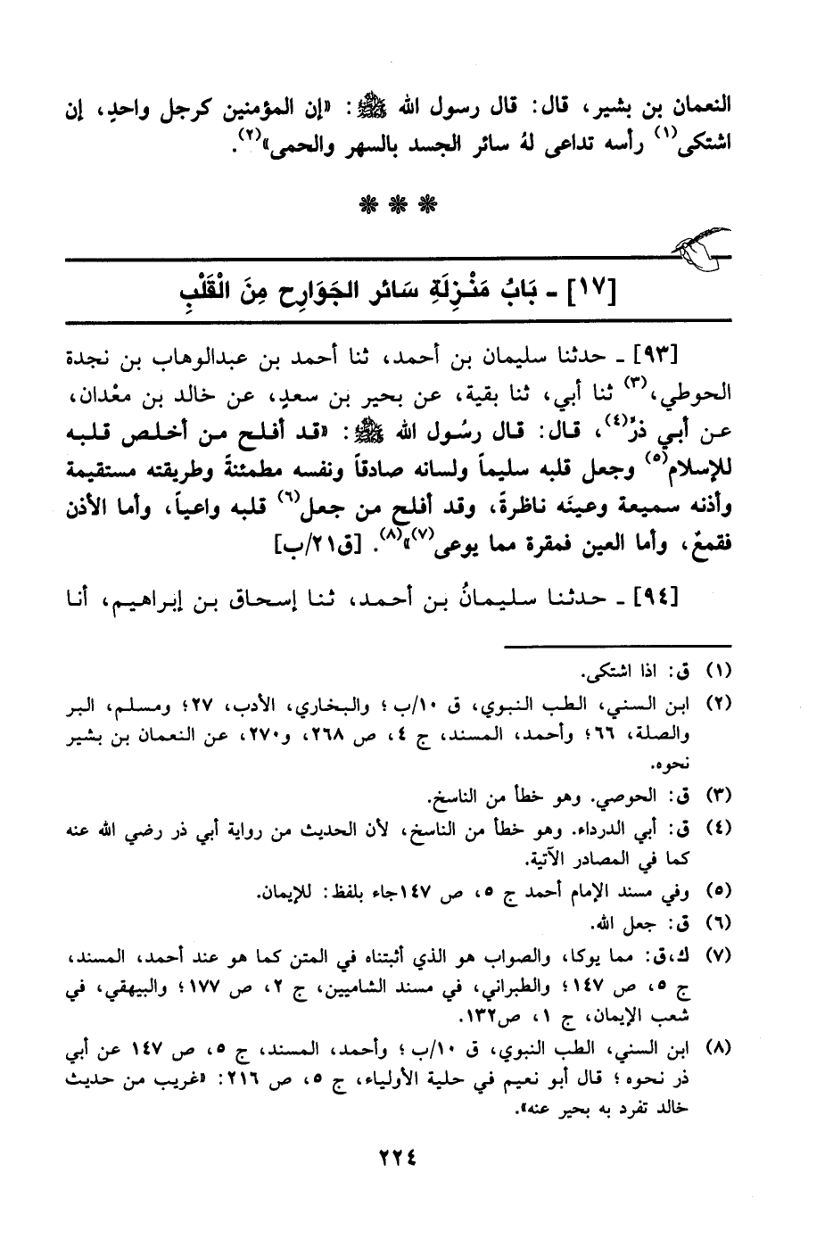 93- حَدَّثَنا سليمان بن أحمد، حَدَّثَنا أحمد بن عبد الوهاب بن نجدة الحوطي، حَدَّثَنا أبي، حَدَّثَنا بقية، عَن بحير بن سعد، عَن خالد بن معدان، عَن أَبِي ذر، قال: قال رسول الله صَلَّى الله عَليْهِ وَسلَّم: قد أفلح من أخلص قلبه للإسلام وجعل قلبه سليما ولسانه صادقا ونفسه مطمئنة وطريقته مستقيمة وأذنه سميعة وعينه ناظره وقد أفلح من جعل قلبه واعيا وأما الأذن فقمع وأما العين فمقرة مما يوعى.