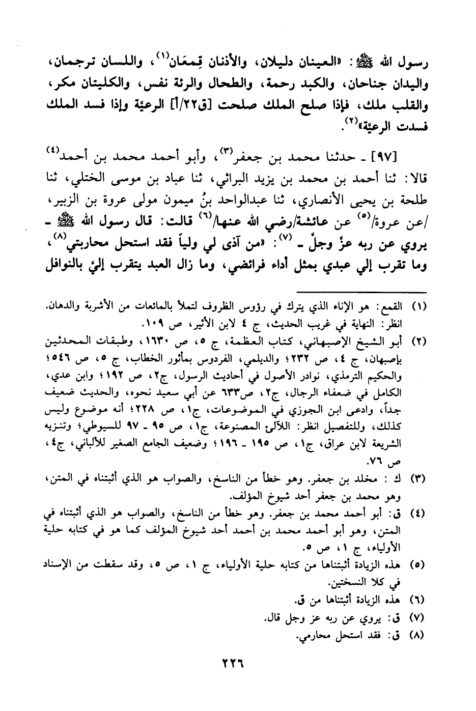 97- حَدَّثَنا محمد بن جعفر وأبو أحمد محمد بن أحمد قالا:، حَدَّثَنا أحمد بن محمد بن يزيد البراثي، حَدَّثَنا عباد بن موسى الختلي، حَدَّثَنا طلحة بن يحيى الأنصاري، حَدَّثَنا عبد الواحد بن ميمون مولى عروة بن الزبير، عَن عروة، عَن عائشة رضي الله عنها قالت: قال رسول الله صَلَّى الله عَليْهِ وَسلَّم يروي، عَن ربه عز وجل: من آذى لي وليا فقد استحل محاربتي وما تقرب إلي عبدي بمثل أداء فرائضي وما زال العبد يتقرب إلي بالنوافل -[227]- حتى أحبه فإذا أحببته كنت عينه التي يبصر بها وأذنه التي يسمع بها ويده التي يبطش بها ورجله التي يمشي بها وقلبه الذي يعقل به إن سألني أعطيته وإن دعاني أجبته وما ترددت، عَن شيء أَنَا فاعله ترددي، عَن موته وذلك أنه يكره الموت وأنا أكره مساءته.