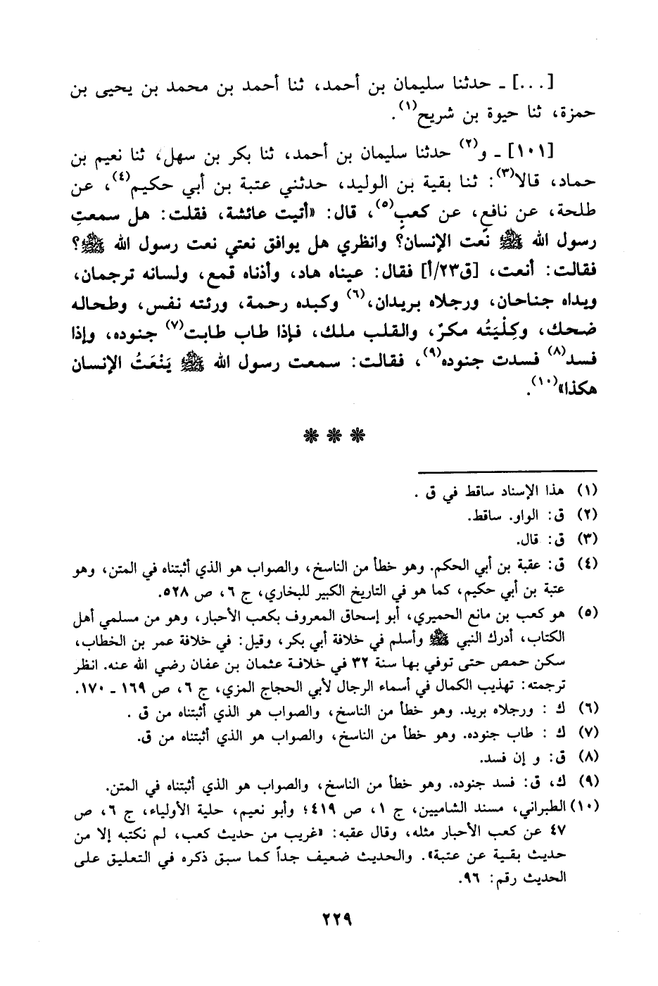 [..] وَحَدَّثنا سليمان بن أحمد، حَدَّثَنا بكر بن سهل، حَدَّثَنا نعيم بن حماد قالا:، حَدَّثَنا بقية بن الوليد حدثني عتبة بن أبي حكيم، عَن طلحة، عَن نافع، عَن كعب قال: أتيت عائشة فقلت: هل سمعت رسول الله صَلَّى الله عَليْهِ وَسلَّم نعت الإنسان؟ وانظري هل يوافق نعتي نعت رسول الله صَلَّى الله عَليْهِ وَسلَّم؟ فقالت: أنعت فقال: عيناه هاد وأذناه قمع ولسانه ترجمان ويداه جناحان ورجلاه بريدان وكبده رحمة ورئته نفس وطحاله ضحك وكليته مكر والقلب ملك فإذا طاب طابت جنوده وإذا فسد فسدت جنوده فقالت: سمعت رسول الله صَلَّى الله عَليْهِ وَسلَّم ينعت الإنسان هكذا.