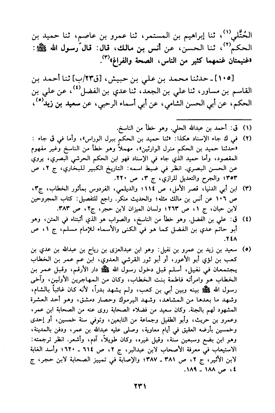 105- حَدَّثَنا محمد بن علي بن حبيش، حَدَّثَنا أحمد بن القاسم بن مساور، حَدَّثَنا علي بن الجعد، حَدَّثَنا عدي بن الفضل، عَن علي بن الحكم، عَن أَبِي الحسن الشامي، عَن أَبِي أسماء الرحبي، عَن سعيد بن زيد -[232]- قال: سمعت رسول الله صَلَّى الله عَليْهِ وَسلَّم يقول: إن لله ضنائن من عباده يضن بهم، عَن القتل والأمراض يعيشهم في عافية ويميتهم في عافية.