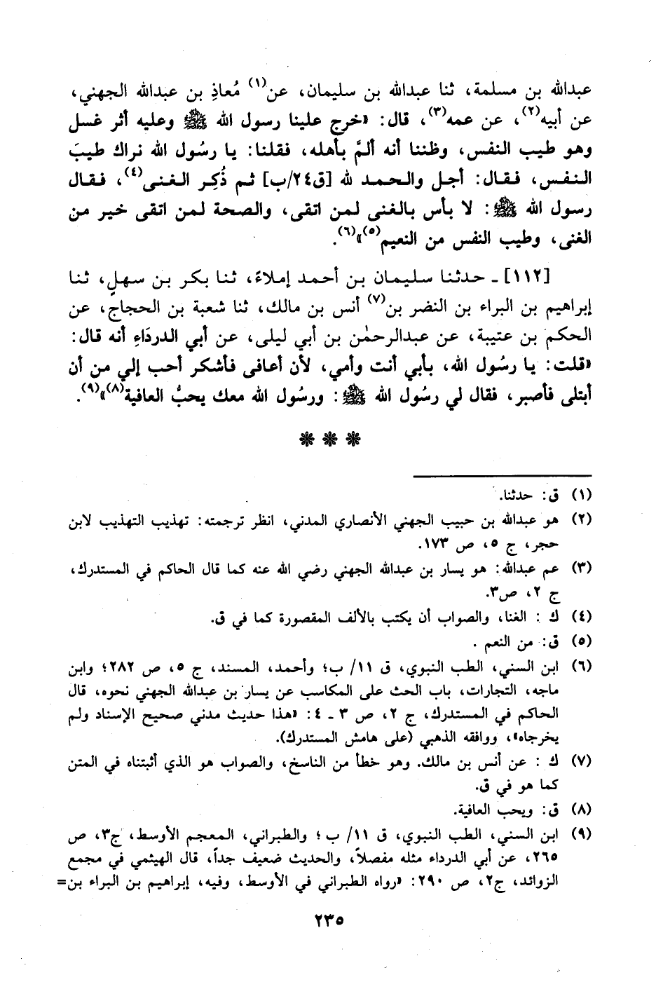 112- حَدَّثَنا سليمان بن أحمد إملاء، حَدَّثَنا بكر بن سهل، حَدَّثَنا إبراهيم بن البراء بن النضر بن أنس بن مالك، حَدَّثَنا شعبة بن الحجاج، عَن الحكم بن عتيبة، عَن عَبد الرحمن بن أبي ليلى، عَن أَبِي الدرداء أنه قال: قلت: يا رسول الله بأبي أنت وأمي لأن أعافي فأشكر أحب إلي من أن أبتلى فأصبر فقال لي رسول الله صَلَّى الله عَليْهِ وَسلَّم: ورسول الله معك يحب العافية.