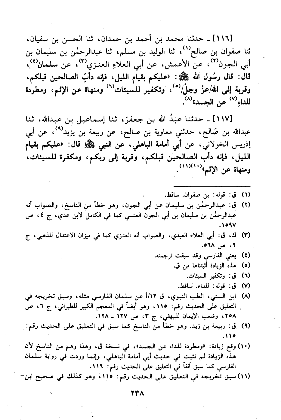116- حَدَّثَنا محمد بن أحمد بن حمدان، حَدَّثَنا الحسن بن سفيان، حَدَّثَنا صفوان بن صالح، حَدَّثَنا الوليد بن مسلم، حَدَّثَنا عبد الرحمن بن سليمان بن أبي الجون، عَن الأعمش، عَن أَبِي العلاء العنزي، عَن سلمان، قال: قال رسول الله صَلَّى الله عَليْهِ وَسلَّم: عليكم بقيام الليل فإنه دأب الصالحين قبلكم وقربة إلى الله عز وجل وتكفير للسيئات ومنهاة، عَن الإثم ومطرة للداء، عَن الجسد.
