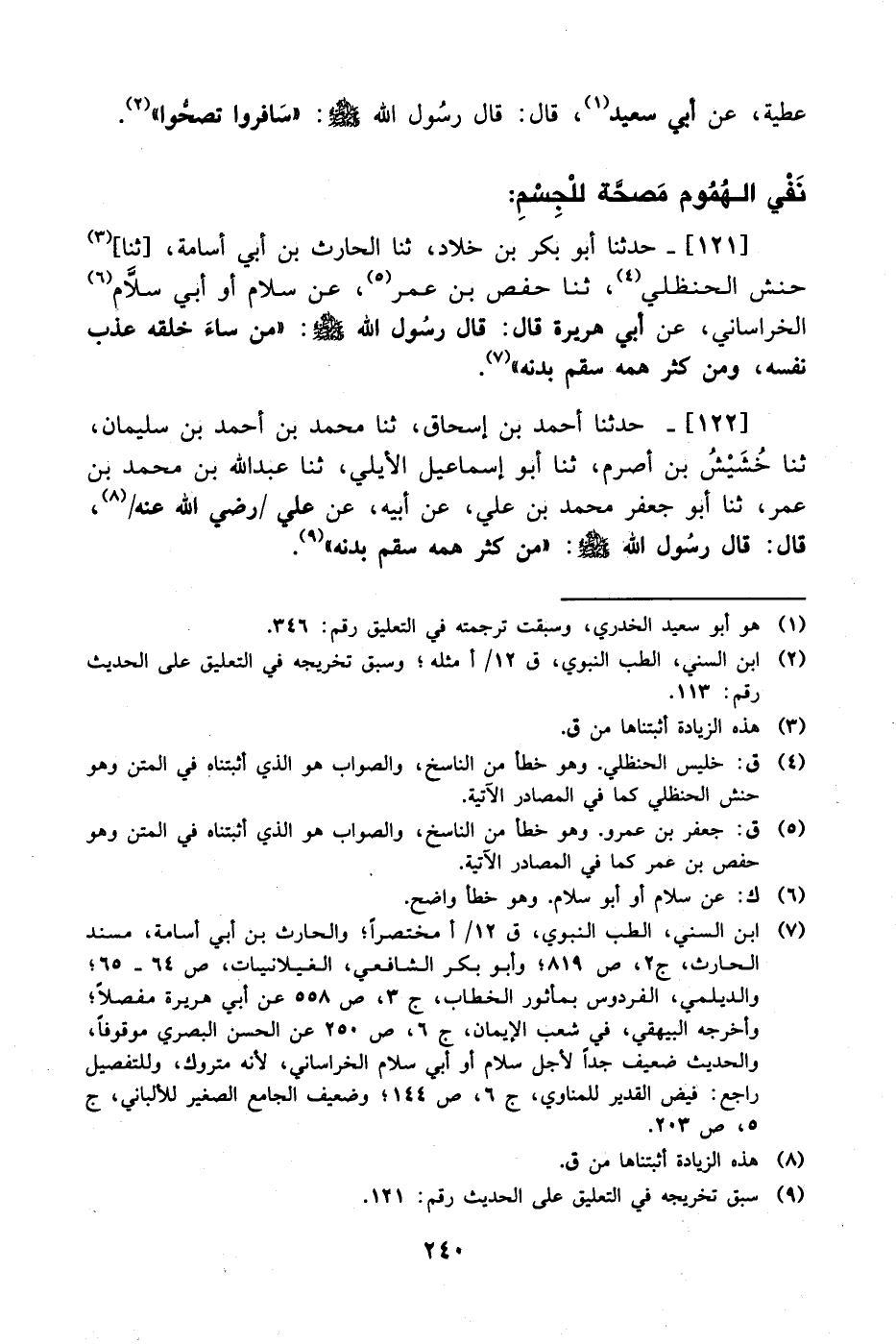 121- حَدَّثَنا أبو بكر بن خلاد، حَدَّثَنا الحارث بن أبي أسامة، حَدَّثَنا حنش الحنظلي، حَدَّثَنا حفص بن عُمَر، عَن سلام، أَو أبي سلام الخراساني، عَن أَبِي هُرَيرة، قال: قال رسول الله صَلَّى الله عَليْهِ وَسلَّم: من ساء خلقه عذب نفسه ومن كثر همه سقم بدنه.