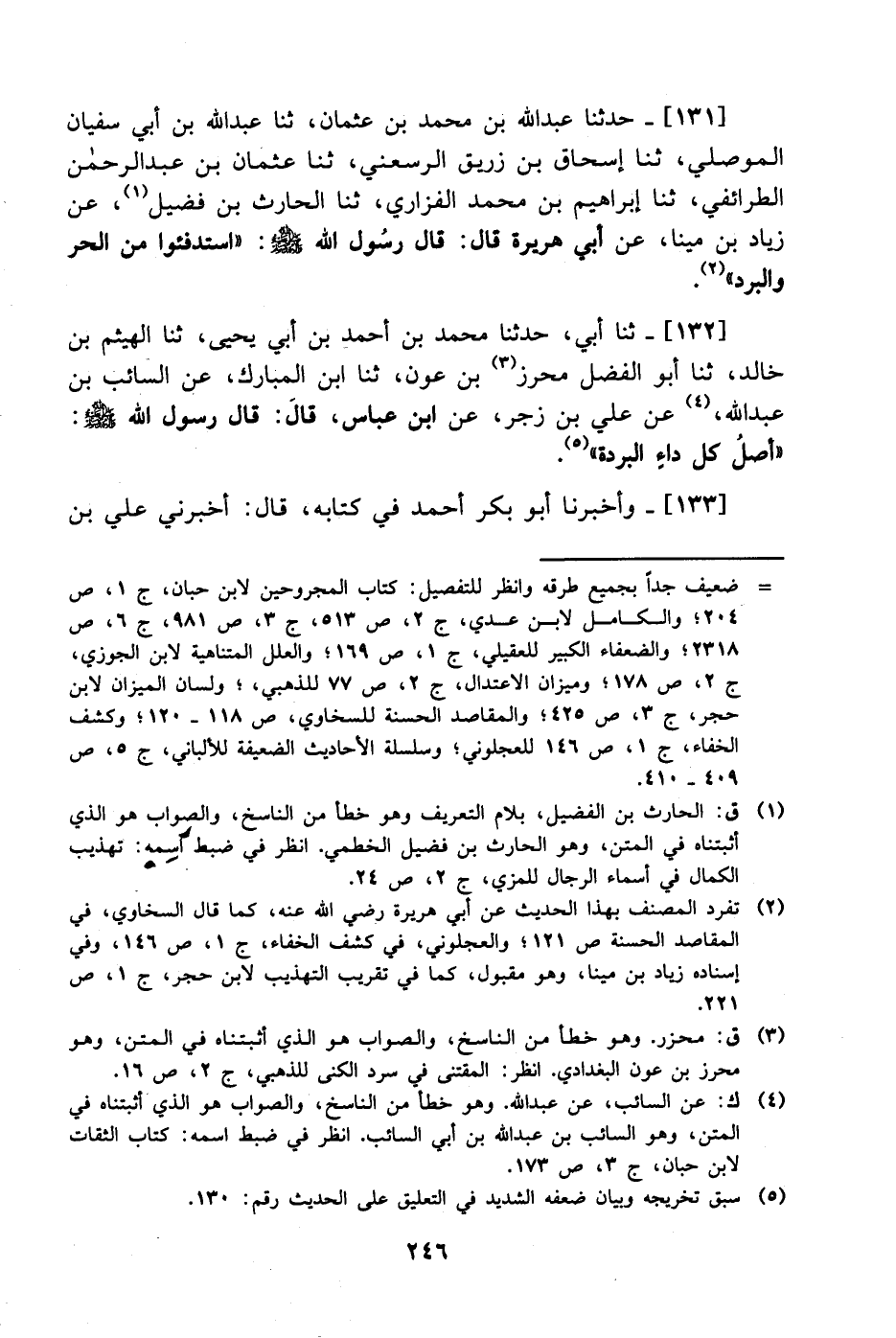 132، حَدَّثَنا أبي حَدَّثَنا محمد بن أحمد بن أبي يحيى، حَدَّثَنا الهيثم بن خالد، حَدَّثَنا أبو الفضل محرز بن عون، حَدَّثَنا ابن المبارك، عَن السائب بن عبد الله، عَن علي بن زجر، عَن ابن عباس، قال: قال رسول الله صَلَّى الله عَليْهِ وَسلَّم: أصل كل داء البردة.