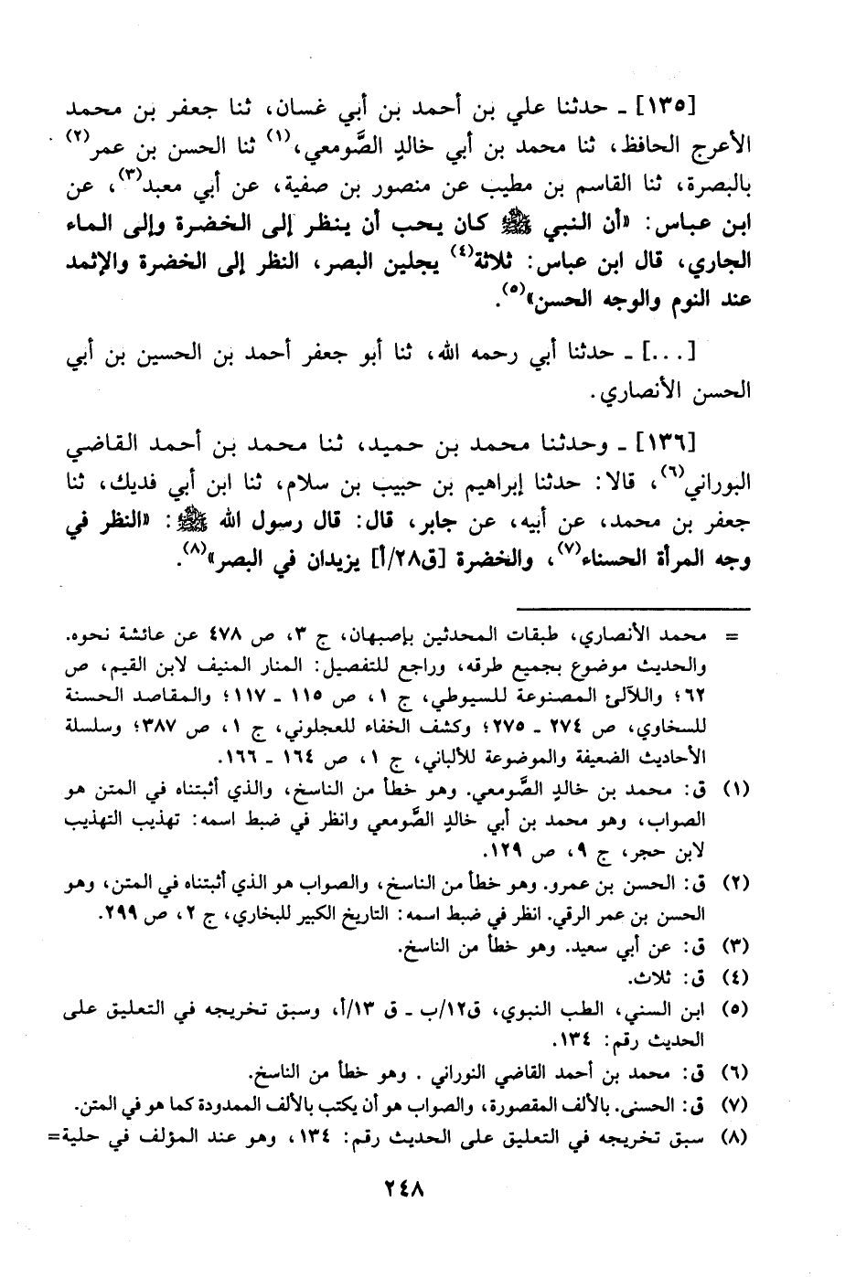 135- حَدَّثَنا علي بن أحمد بن أبي غسان، حَدَّثَنا جعفر بن محمد الأعرج الحافظ، حَدَّثَنا محمد بن أبي خالد الصومعي، حَدَّثَنا الحسن بن عُمَر بالبصرة، حَدَّثَنا القاسم بن مطيب، عَن منصور بن صفية، عَن أَبِي معبد، عَن ابن عباس: أن النبي صَلَّى الله عَليْهِ وَسلَّم كان يحب أن ينظر إلى الخضرة وإلى الماء الجاري قال ابن عباس: ثلاثة يجلين البصر النظر إلى الخضرة والإثمد عند النوم والوجه الحسن.