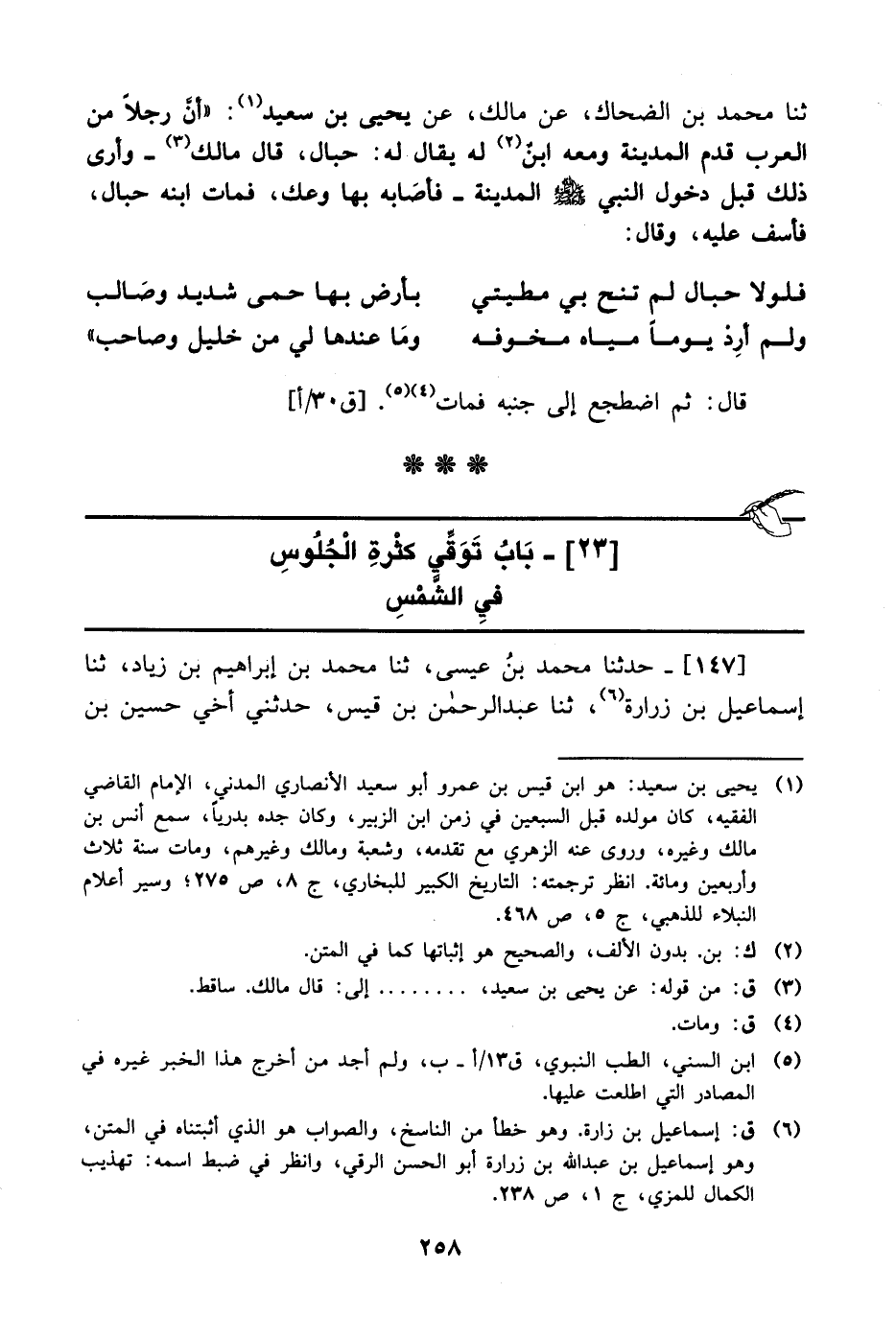 147- حَدَّثَنا محمد بن عيسى، حَدَّثَنا محمد بن إبراهيم بن زياد، حَدَّثَنا إسماعيل بن زرارة، حَدَّثَنا عبد الرحمن بن قيس حدثني أخي حسين بن -[259]- قيس، عَن أَبِي بردة، عَن أبيه، عَن النبي صَلَّى الله عَليْهِ وَسلَّم: نهى أن يجلس الرجل بين الظل والشمس.