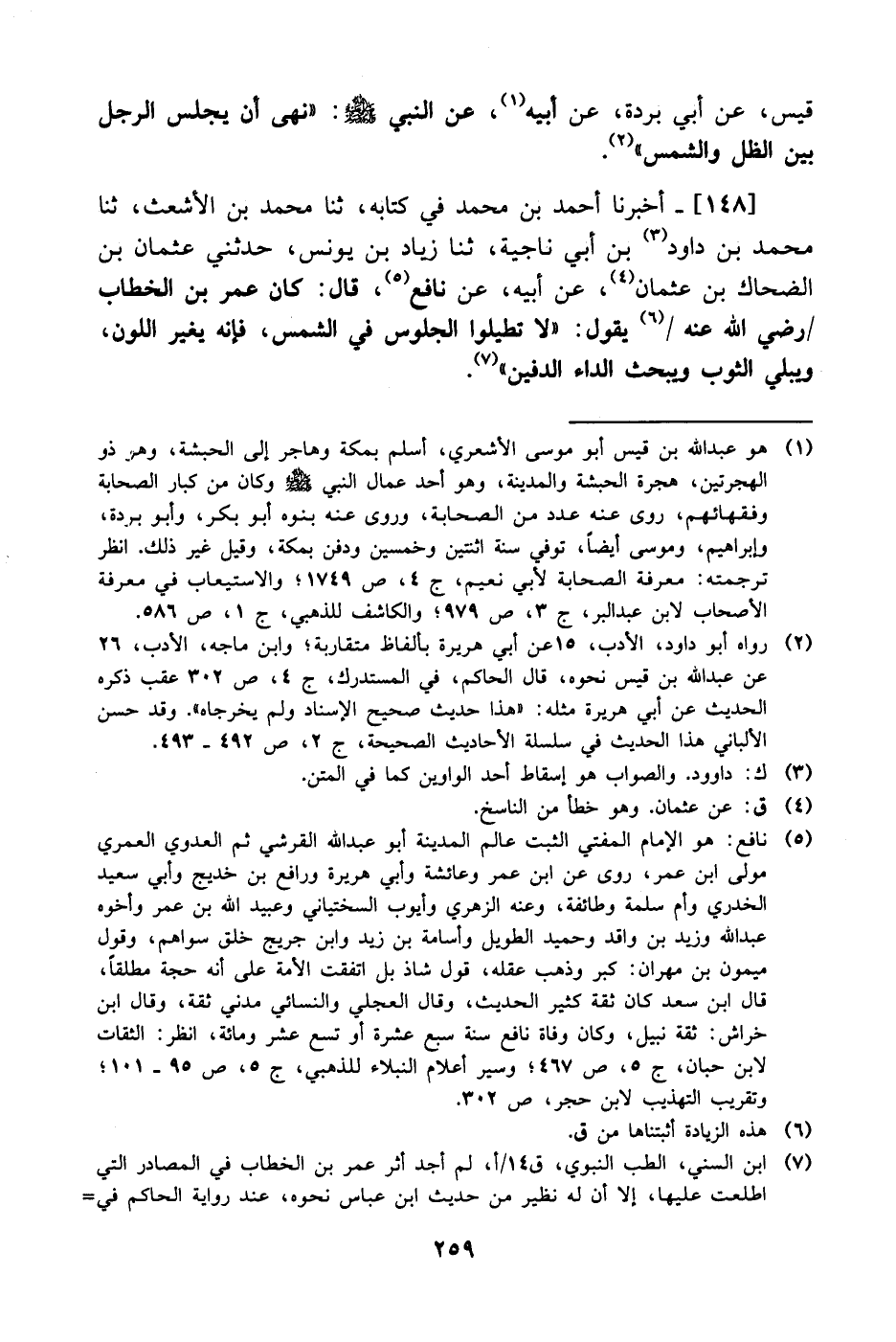 148- أخبرنا أحمد بن محمد في كتابه، حَدَّثَنا محمد بن الأشعث، حَدَّثَنا محمد بن داود بن أبي ناجية، حَدَّثَنا زياد بن يونس حدثني عثمان بن الضحاك بن عثمان، عَن أبيه، عَن نافع قال: كان عُمَر بن الخطاب رضي الله عنه يقول: لا تطيلوا الجلوس في الشمس فإنه يغير اللون ويبلي الثوب ويبحث الداء الدفين.