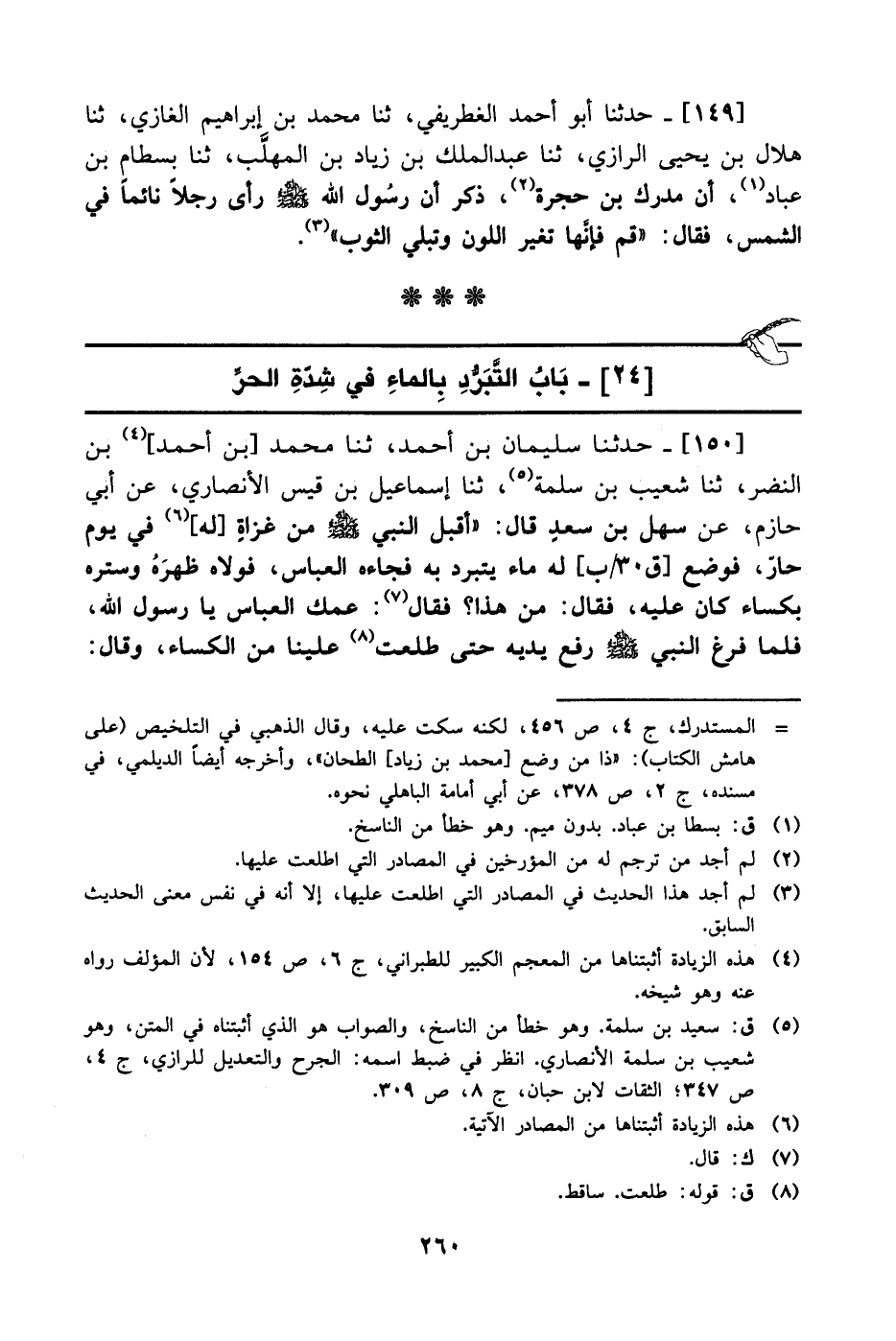 150- حَدَّثَنا سليمان بن أحمد، حَدَّثَنا محمد بن أحمد بن النضر، حَدَّثَنا شعيب بن سلمة، حَدَّثَنا إسماعيل بن قيس الأنصاري، عَن أَبِي حازم، عَن سهل بن سعد قال: أقبل النبي صَلَّى الله عَليْهِ وَسلَّم من غزاة له في يوم حار فوضع له ماء يتبرد به فجاءه العباس فولاه ظهره وستره بكساء كان عليه فقال: من هذا؟ فقال: عمك العباس يا رسول الله فلما فرغ النبي صَلَّى الله عَليْهِ وَسلَّم رفع يديه حتى طلعت علينا من الكساء وقال: -[261]- سترك الله ياعم وذريتك من النار.
