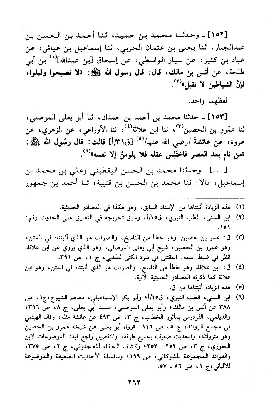153- حَدَّثَنا محمد بن أحمد بن حمدان، حَدَّثَنا أبو يعلى الموصلي، حَدَّثَنا عَمْرو بن الحصين، حَدَّثَنا ابن علاثة، حَدَّثَنا الأوزاعي، عَن الزُّهْرِيّ، عَن عروة، عَن عائشة رضي الله عنها قالت: قال رسول الله صَلَّى الله عَليْهِ وَسلَّم: من نام بعد العصر فاختلس عقله فلا يلومن إلا نفسه.