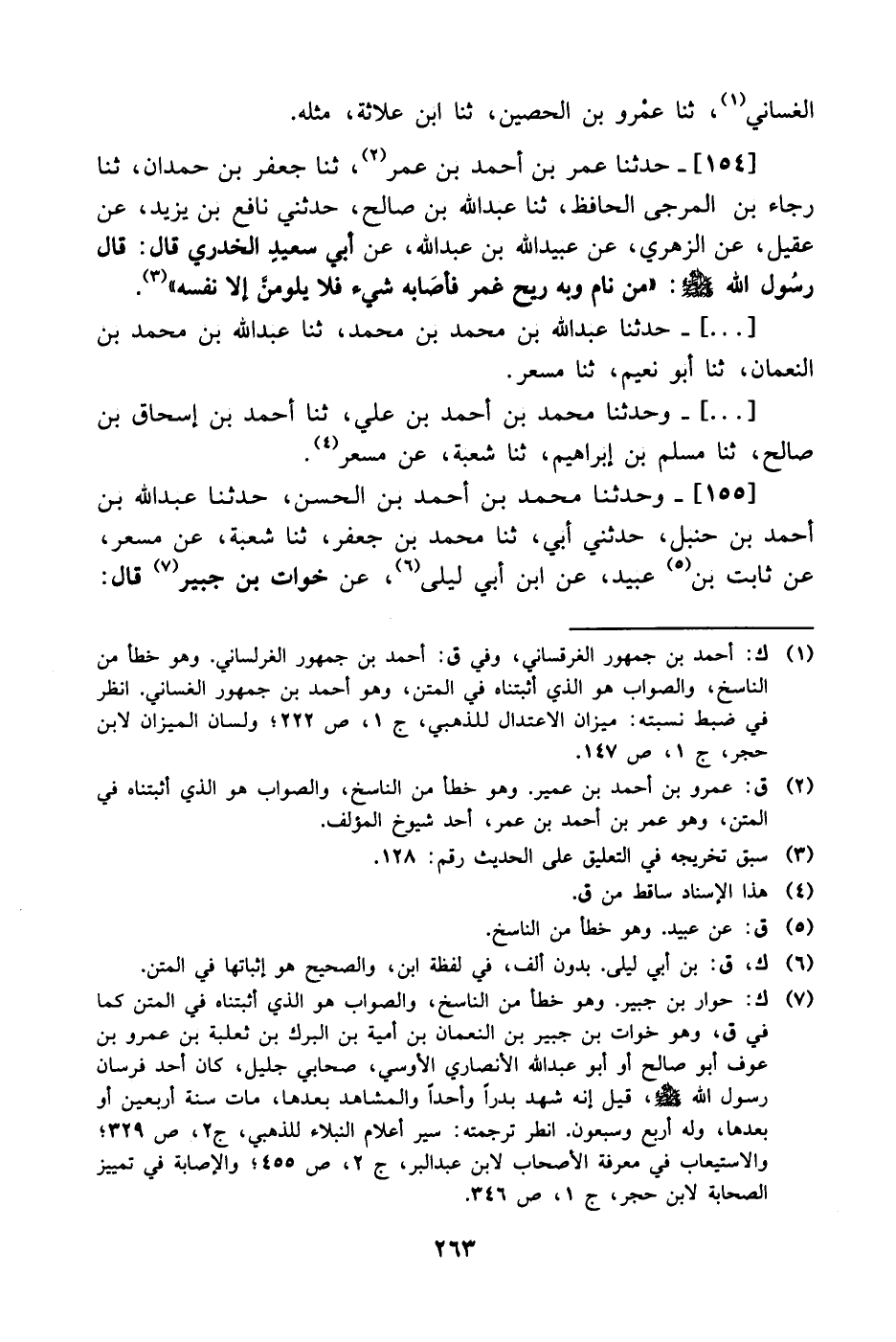 154- حَدَّثَنا عُمَر بن أحمد بن عُمَر، حَدَّثَنا جعفر بن حمدان، حَدَّثَنا رجاء بن المرجى الحافظ، حَدَّثَنا عبد الله بن صالح حدثني نافع بن يزيد، عَن عقيل، عَن الزُّهْرِيّ، عَن عبيد الله بن عبد الله، عَن أَبِي سعيد الخدري، قال: قال رسول الله صَلَّى الله عَليْهِ وَسلَّم: من نام وبه ريح غمر فأصابه شيء فلا يلومن إلا نفسه.