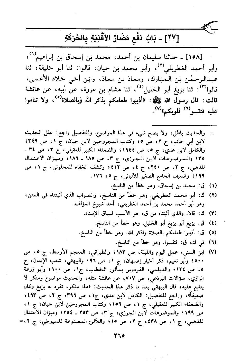 158- حَدَّثَنا سليمان بن أحمد محمد بن إسحاق بن إبراهيم وأبو أحمد الغطريفي وأبو محمد بن حيان قالوا:، حَدَّثَنا أبو خليفة، حَدَّثَنا عبد الرحمن بن المبارك ومعاذ بن معاذ وابن أخي خلاد الأعمى قالوا:، حَدَّثَنا بزيغ أبو الخليل، حَدَّثَنا هشام بن عروة، عَن أبيه، عَن عائشة قالت: قال رسول الله صَلَّى الله عَليْهِ وَسلَّم: أذيبوا طعامكم بذكر الله وبالصلاة ولا تناموا عليه فتقسوا قلوبكم.