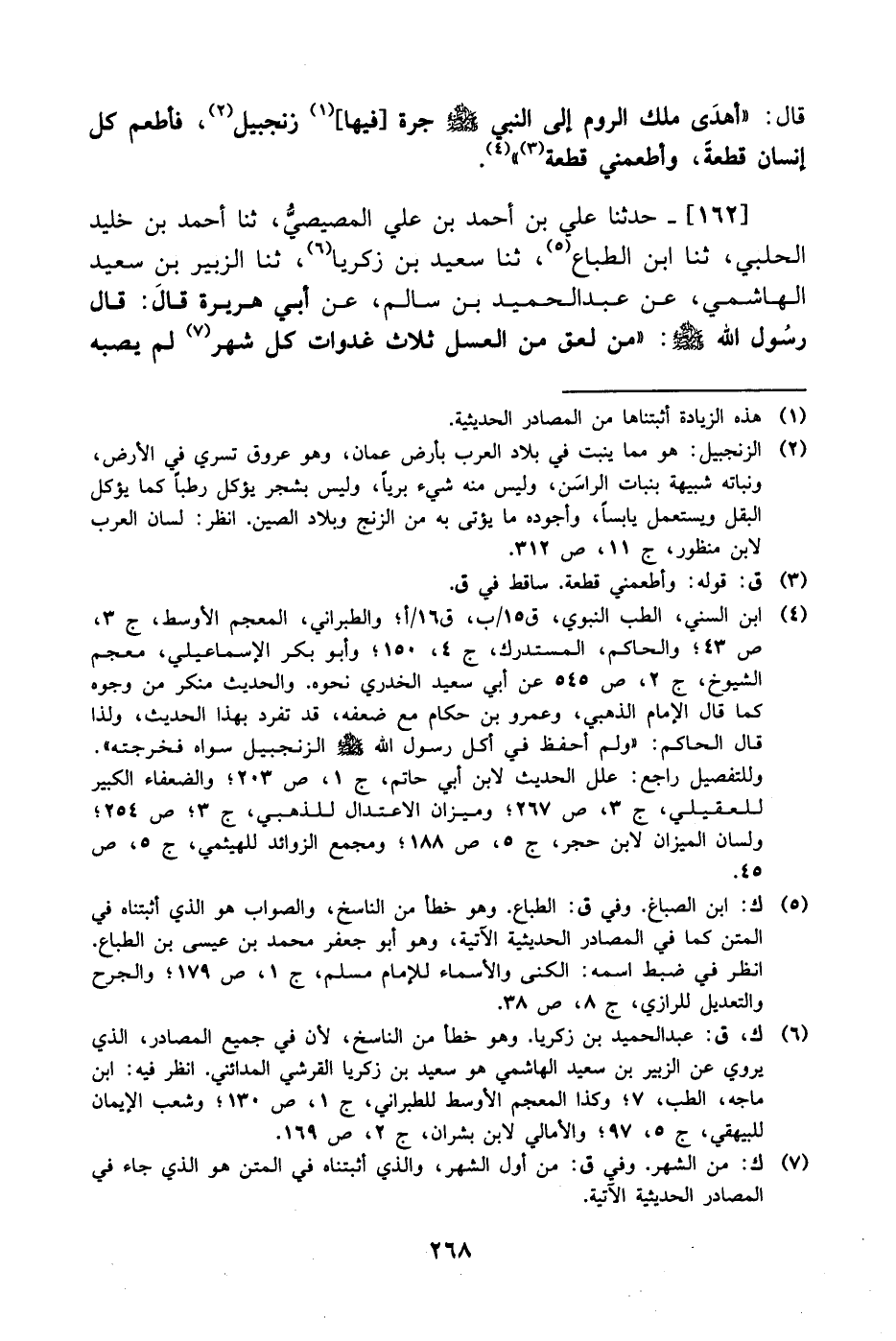 162- حَدَّثَنا علي بن أحمد بن علي المصيصي، حَدَّثَنا أحمد بن خليد الحلبي، حَدَّثَنا ابن الطباع، حَدَّثَنا سعيد بن زكريا، حَدَّثَنا الزبير بن سعيد الهاشمي، عَن عَبد الحميد بن سالم، عَن أَبِي هُرَيرة، قال: قال رسول الله صَلَّى الله عَليْهِ وَسلَّم: من لعق من العسل ثلاث غدوات كل شهر لم يصبه -[269]- عظيم من البلاء.