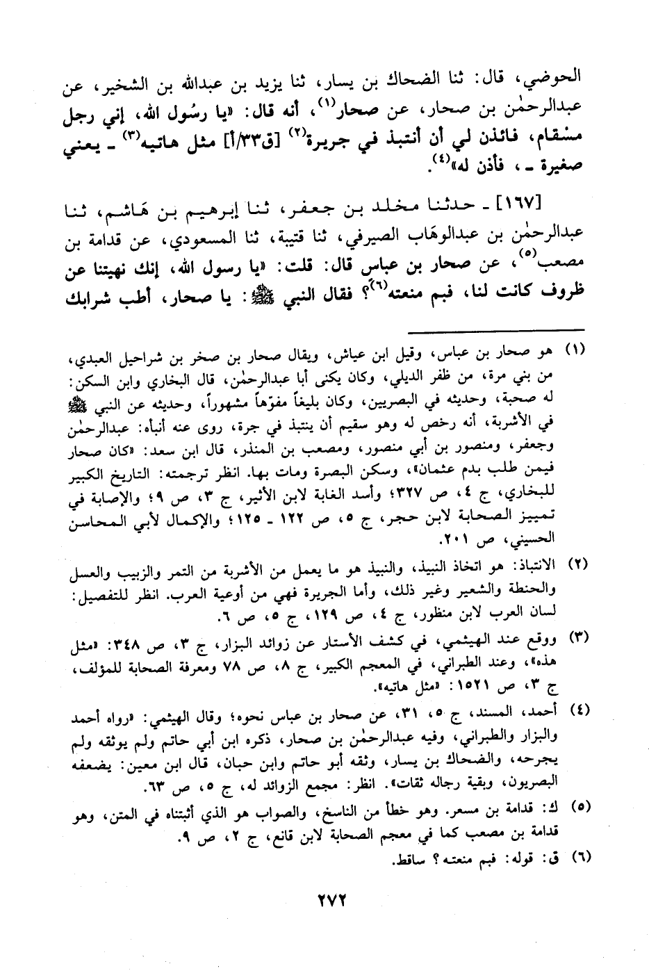 167- حَدَّثَنا مخلد بن جعفر، حَدَّثَنا إبراهيم بن هاشم، حَدَّثَنا عبد الرحمن بن عبد الوهاب الصيرفي، حَدَّثَنا قتيبة، حَدَّثَنا المسعودي، عَن قدامة بن مصعب، عَن صحار بن عباس قال: قلت: يا رسول الله إنك نهيتنا، عَن ظروف كانت لنا فبم منعته؟ فقال النبي صَلَّى الله عَليْهِ وَسلَّم: ياصحار أطب شرابك -[273]- واسق جارك.
