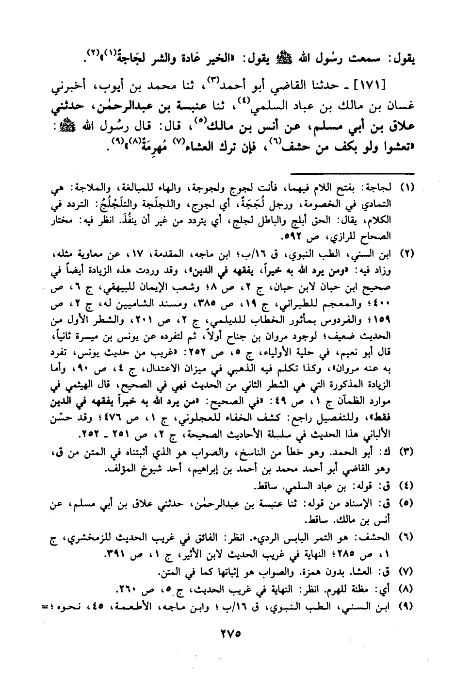 171- حَدَّثَنا القاضي أبو أحمد، حَدَّثَنا محمد بن أيوب أخبرني غسان بن مالك بن عباد السلمي، حَدَّثَنا عنبسة بن عبد الرحمن حدثني علاق بن أبي مسلم، عَن أنس بن مالك، قال: قال رسول الله صَلَّى الله عَليْهِ وَسلَّم: تعشوا ولو بكف من حشف فإن ترك العشاء مهرمة.