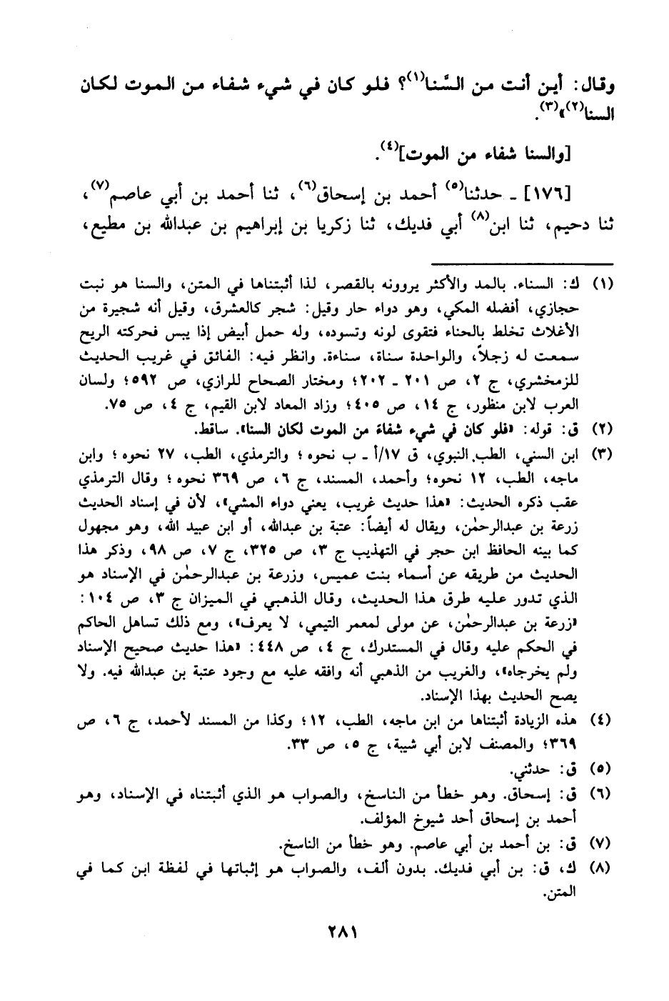 176- حَدَّثَنا أحمد بن إسحاق، حَدَّثَنا أحمد بن أبي عاصم، حَدَّثَنا دحيم، حَدَّثَنا ابن أبي فديك، حَدَّثَنا زكريا بن إبراهيم بن عبد الله بن مطيع، -[282]- عَن ركيح بن أبي عبيدة، عَن أبيه، عَن أم سلمة قالت: دخل علي رسول الله صَلَّى الله عَليْهِ وَسلَّم فقال لي: ما لي أراك مرتثة فقلت: شربت دواء المشي أستمشي به قال: وما هو؟ قالت: الشبرم فقال: ما لك وللشبرم؟ فإنه حار حار وعليك بالسنا والسنوت فإن -[283]- فيهما شفاء من كل داء إلا السام.