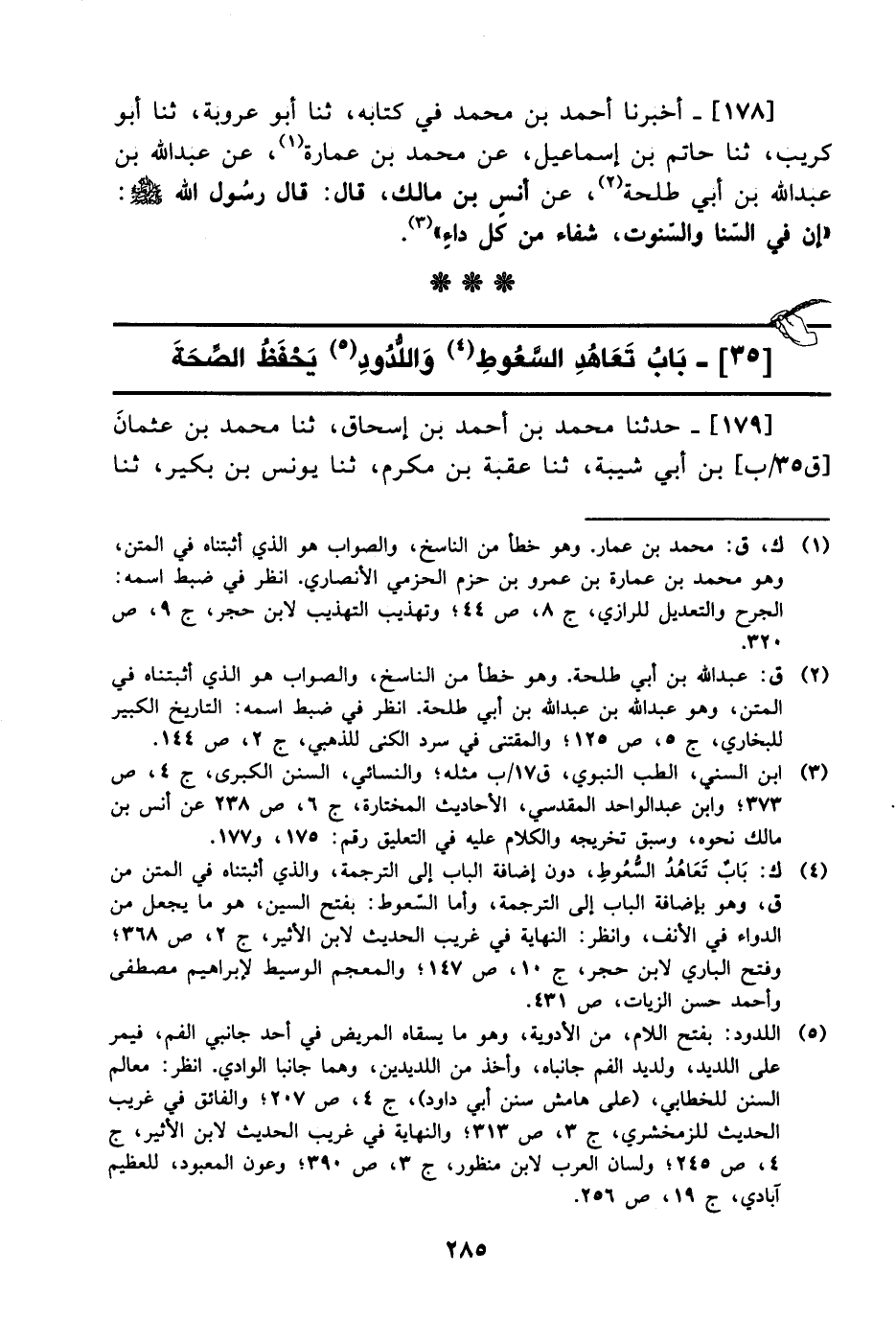 178- أخبرنا أحمد بن محمد في كتابه، حَدَّثَنا أبو عروبة، حَدَّثَنا أبو كريب، حَدَّثَنا حاتم بن إسماعيل، عَن محمد بن عمارة، عَن عَبد الله بن عبد الله بن أبي طلحة، عَن أنس بن مالك، قال: قال رسول الله صَلَّى الله عَليْهِ وَسلَّم: إن في السنا والسنوت شفاء من كل داء.
