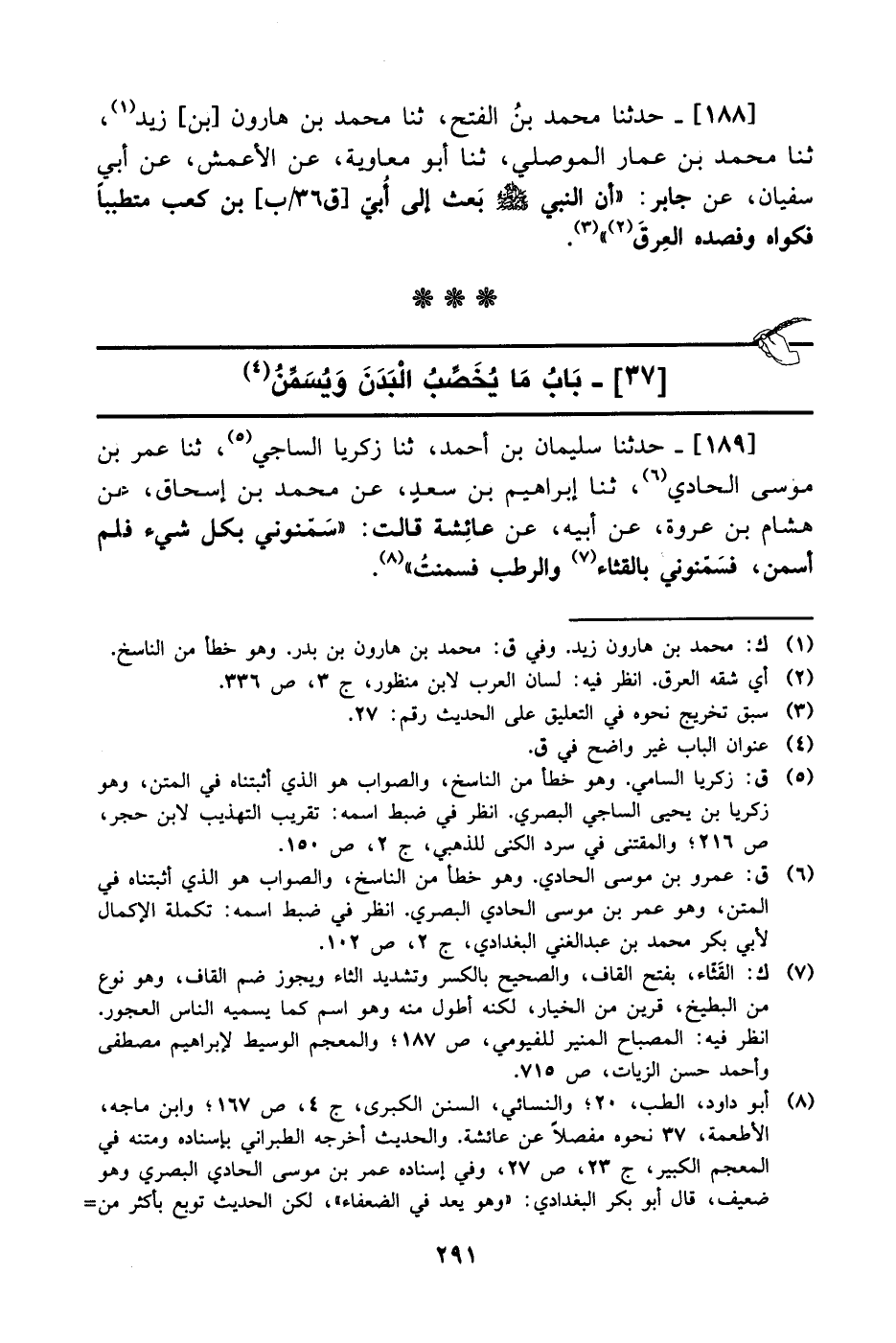 188- حَدَّثَنا محمد بن الفتح، حَدَّثَنا محمد بن هارون بن زيد، حَدَّثَنا محمد بن عمار الموصلي، حَدَّثَنا أبو معاوية، عَن الأعمش، عَن أَبِي سفيان، عَن جابر: أن النبي صَلَّى الله عَليْهِ وَسلَّم بعث إلى أبي بن كعب متطبباً فكواه وفصده العرق.