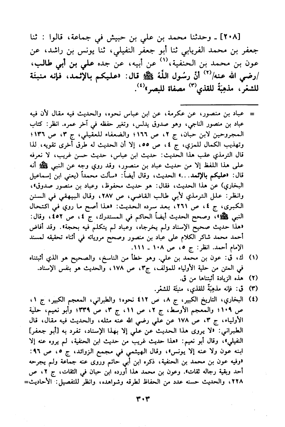 208- وَحَدَّثنا محمد بن علي بن حبيش في جماعة قالوا:، حَدَّثَنا جعفر بن محمد الفريابي، حَدَّثَنا أبو جعفر النفيلي، حَدَّثَنا يونس بن راشد، عَن عون بن محمد بن الحنفية، عَن أبيه، عَن جَدِّه علي بن أبي طالب رضي الله عنه أن رسول الله صَلَّى الله عَليْهِ وَسلَّم قال: عليكم بالإثمد فإنه منبتة للشعر مذهبة للقذي مصفاة للبصر.