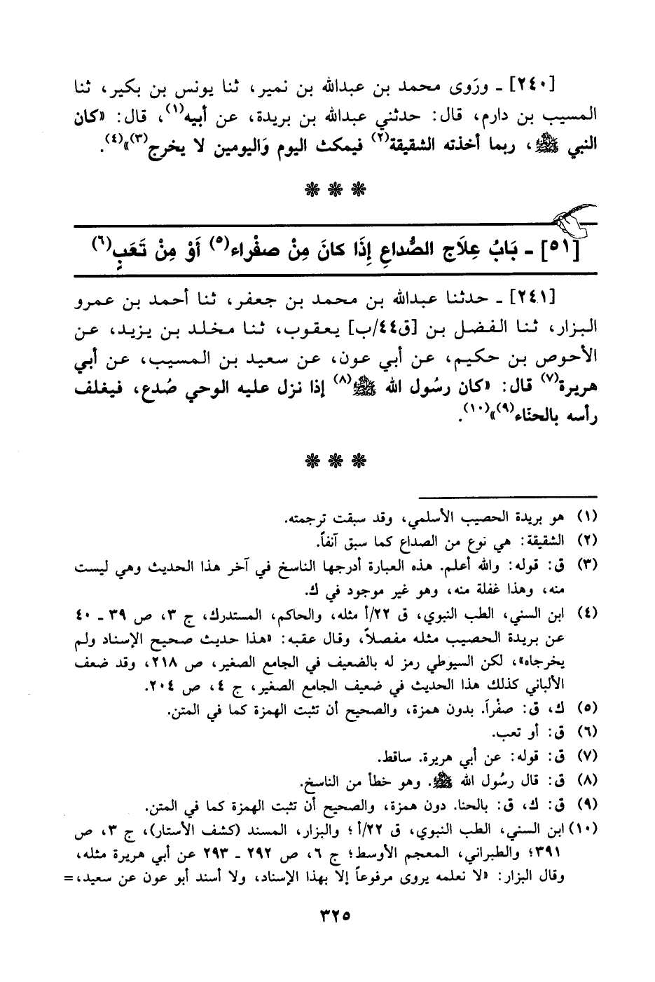 240- وروى محمد بن عبد الله بن نمير، حَدَّثَنا يونس بن بكير، حَدَّثَنا المُسَيَّب بن دارم قال حدثني عبد الله بن بريدة، عَن أبيه قال: كان النبي صَلَّى الله عَليْهِ وَسلَّم ربما أخذته الشقيقة فيمكث اليوم واليومين لا يخرج.