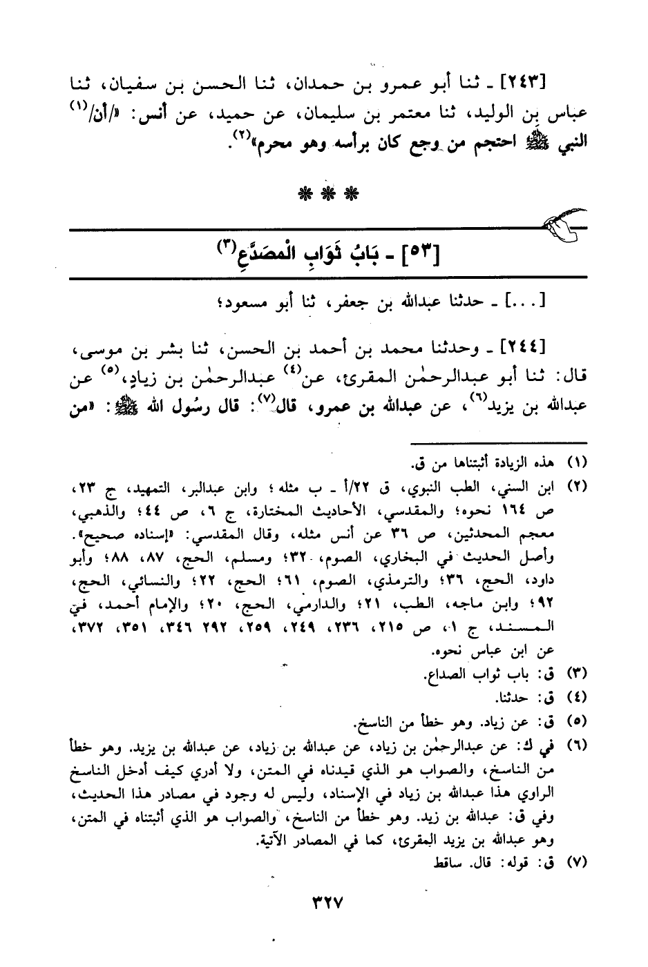 [..] وَحَدَّثنا محمد بن أحمد بن الحسن، حَدَّثَنا بشر بن موسى قال:، حَدَّثَنا أبو عبد الرحمن المقرئ، عَن عَبد الرحمن بن زياد، عَن عَبد الله بن يزيد، عَن عَبد الله بن عَمْرو، قال: قال رسول الله صَلَّى الله عَليْهِ وَسلَّم: من -[328]- صدع رأسه في سبيل الله فاحتسبه غفر له ما كان قبل ذلك من ذنب.