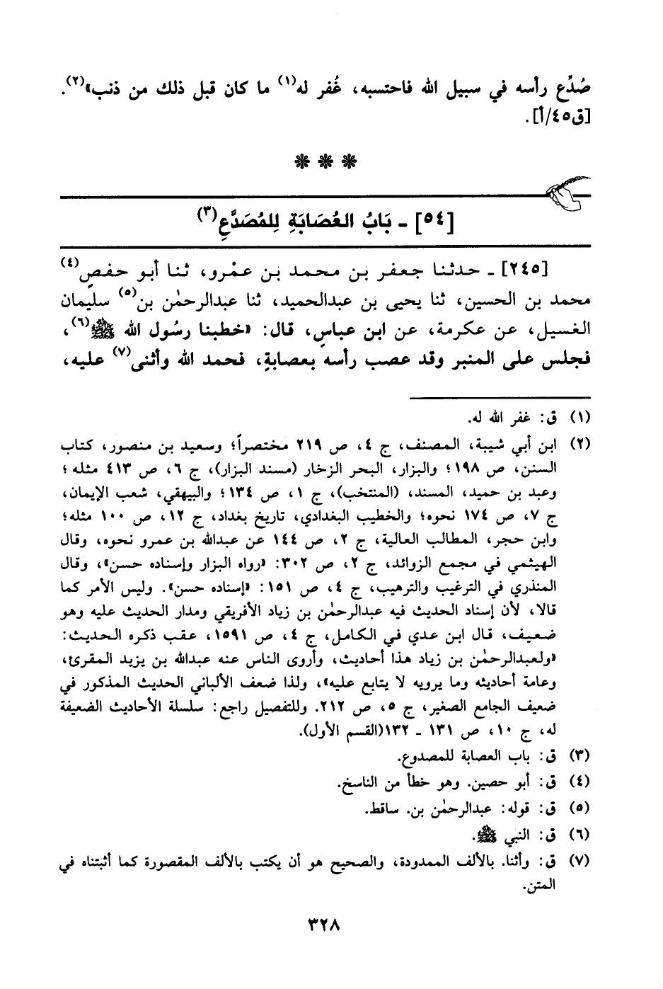 245- حَدَّثَنا جعفر بن محمد بن عَمْرو، حَدَّثَنا أبو حفص محمد بن الحسين، حَدَّثَنا يحيى بن عبد الحميد، حَدَّثَنا عبد الرحمن بن سليمان الغسيل، عَن عِكرمة، عَن ابن عباس قال: خطبنا رسول الله صَلَّى الله عَليْهِ وَسلَّم فجلس على المنبر وقد عصب رأسه بعصابة فحمد الله وأثنى عليه -[329]- فقال: أما بعد.