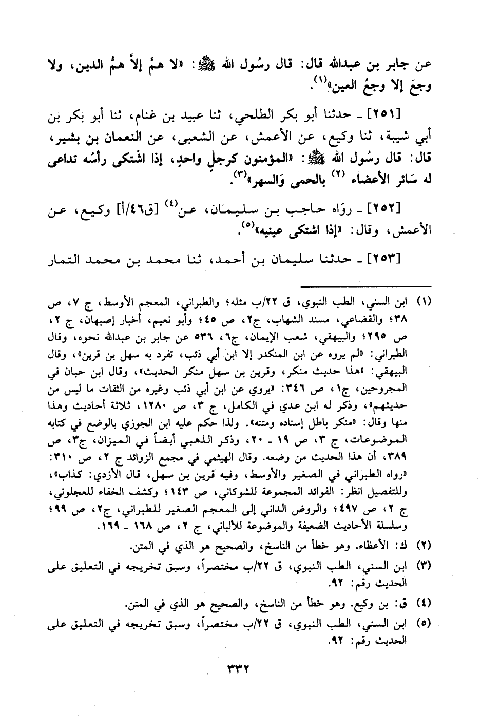 251- حَدَّثَنا أبو بكر الطلحي، حَدَّثَنا عبيد بن غنام، حَدَّثَنا أبو بكر بن أبي شيبة، حَدَّثَنا وكيع، عَن الأعمش، عَن الشعبي، عَن النعمان بن بشير، قال: قال رسول الله صَلَّى الله عَليْهِ وَسلَّم: المؤمنون كرجل واحد إذا اشتكى رأسه تداعى له سائر الأعضاء بالحمى والسهر.