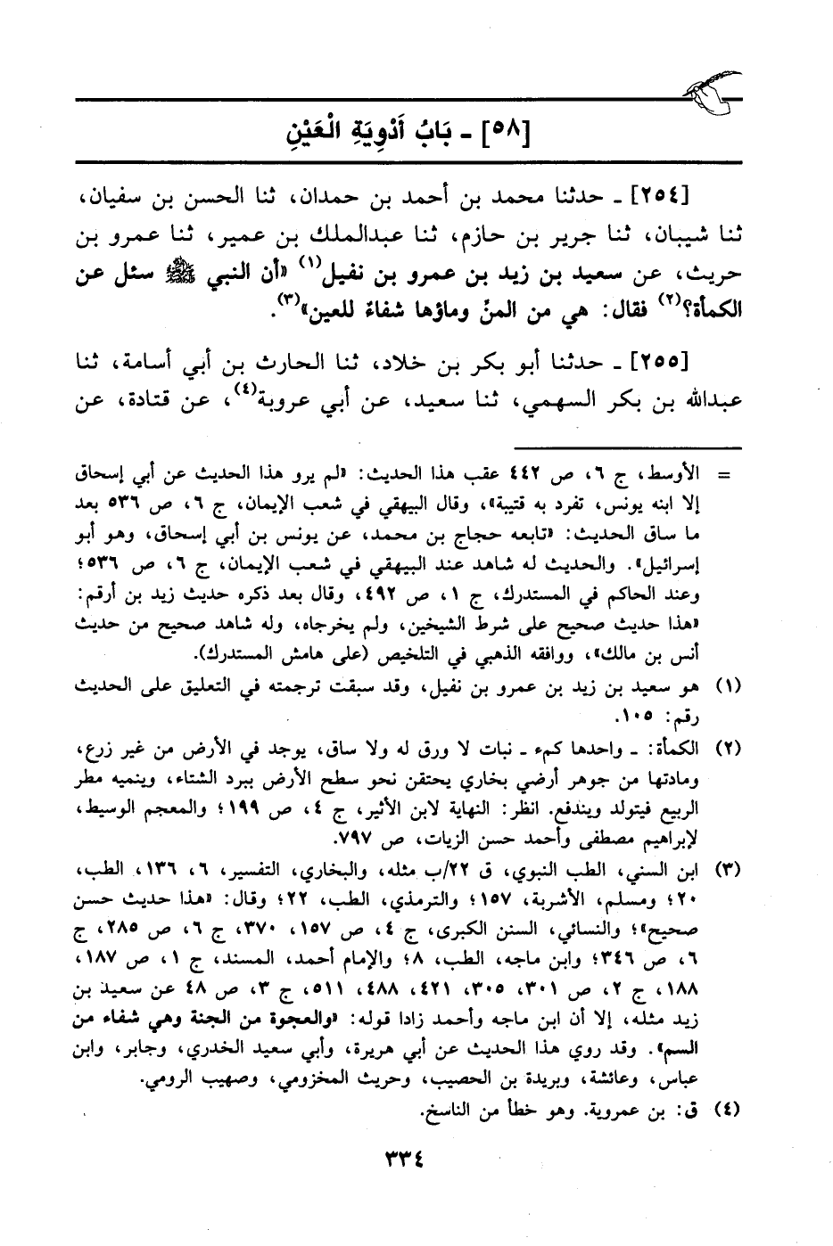 254- حَدَّثَنا محمد بن أحمد بن حمدان، حَدَّثَنا الحسن بن سفيان، حَدَّثَنا شيبان، حَدَّثَنا جرير بن حازم، حَدَّثَنا عبد الملك بن عمير، حَدَّثَنا عَمْرو بن حريث، عَن سعيد بن زيد بن عَمْرو بن نفيل أن النبي صَلَّى الله عَليْهِ وَسلَّم سئل، عَن الكمأة؟ فقال: هي من المن وماؤها شفاء للعين.