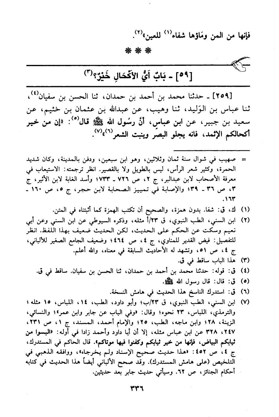 259- حَدَّثَنا محمد بن أحمد بن حمدان، حَدَّثَنا الحسن بن سفيان، حَدَّثَنا عباس بن الوليد، حَدَّثَنا وهيب، عَن عَبد الله بن عثمان بن خثيم، عَن سعيد بن جبير، عَن ابن عباس أن رسول الله صَلَّى الله عَليْهِ وَسلَّم قال: إن من خير أكحالكم الإثمد فإنه يجلو البصر وينبت الشعر.