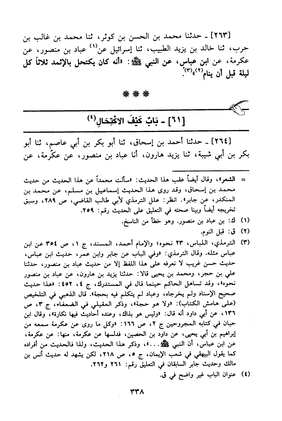 263- حَدَّثَنا محمد بن الحسن بن كوثر، حَدَّثَنا محمد بن غالب بن حرب، حَدَّثَنا خالد بن يزيد الطبيب، حَدَّثَنا إسرائيل، عَن عباد بن منصور، عَن عِكرمة، عَن ابن عباس، عَن النبي صَلَّى الله عَليْهِ وَسلَّم: أنه كان يكتحل بالإثمد ثلاثا كل ليلة قبل أن ينام.