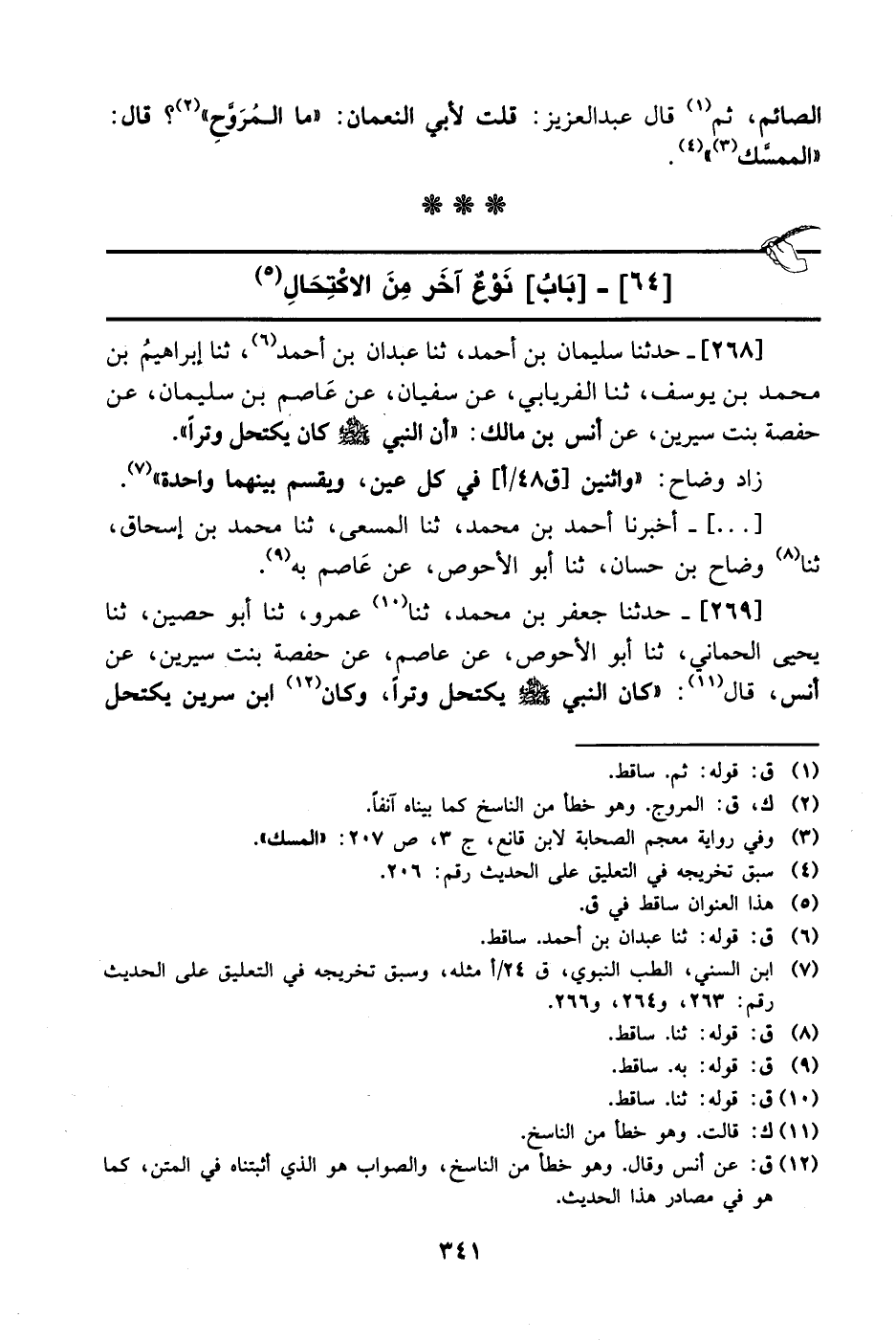 [..] حَدَّثَنا جعفر بن محمد، حَدَّثَنا عَمْرو، حَدَّثَنا أبو حصين، حَدَّثَنا يحيى الحماني، حَدَّثَنا أبو الأحوص، عَن عاصم، عَن حفصة بنت سيرين، عَن أنس قال: كان النبي صَلَّى الله عَليْهِ وَسلَّم يكتحل وترا وكان ابن سيرين يكتحل -[342]- في كل عين مرتين ويقسم بينهما واحدة.