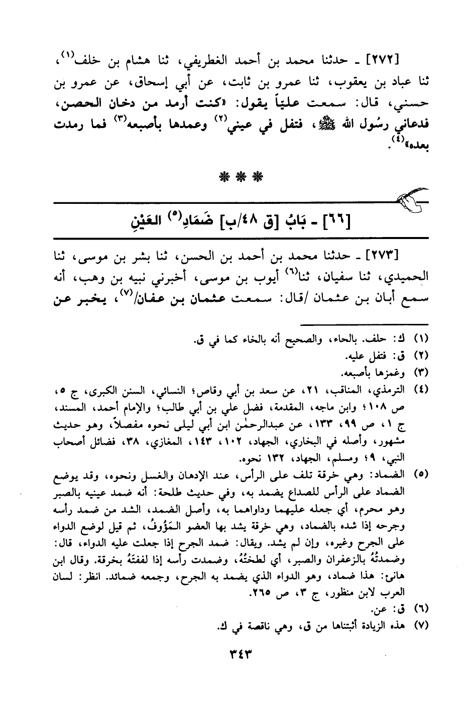 272- حَدَّثَنا محمد بن أحمد الغطريفي، حَدَّثَنا هشام بن خلف، حَدَّثَنا عباد بن يعقوب، حَدَّثَنا عَمْرو بن ثابت، عَن أَبِي إسحاق، عَن عَمْرو بن حسني قال: سمعت عليا يقول: كنت أرمد من دخان الحصن فدعاني رسول الله صَلَّى الله عَليْهِ وَسلَّم فتفل في عيني وعمدها بأصبعه فما رمدت بعده.