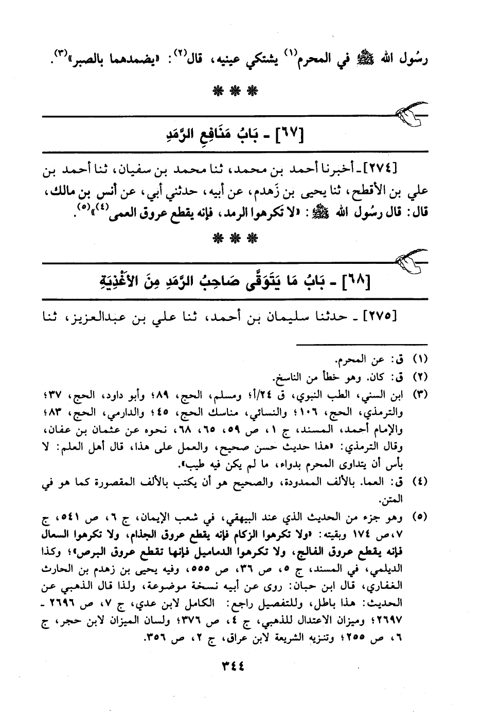 274- أخبرنا أحمد بن محمد، حَدَّثَنا محمد بن سفيان، حَدَّثَنا أحمد بن علي بن الأقطح، حَدَّثَنا يحيى بن زهدم، عَن أبيه حدثني أبي، عَن أنس بن مالك، قال: قال رسول الله صَلَّى الله عَليْهِ وَسلَّم: لا تكرهوا الرمد فإنه يقطع عروق العمي.