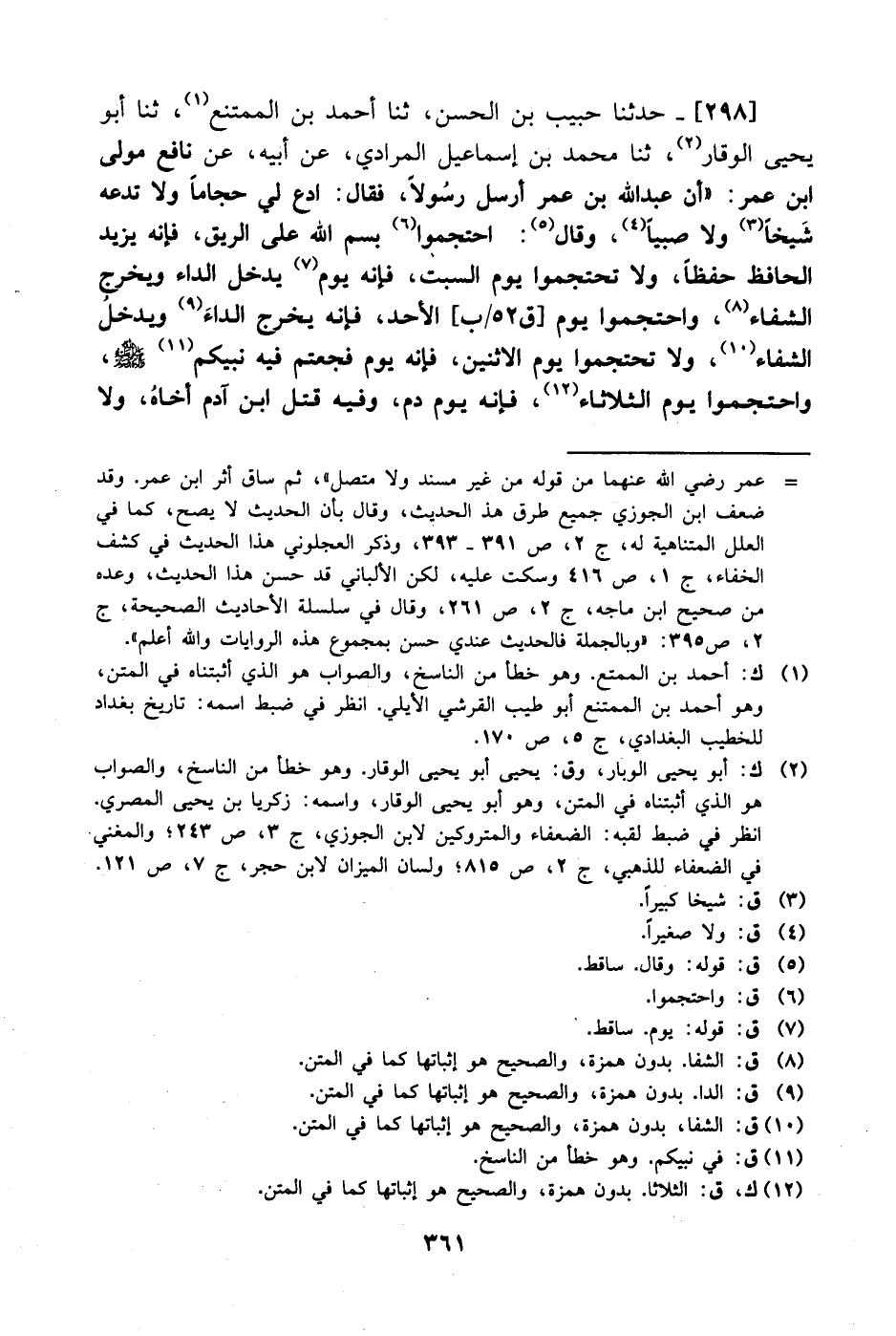298- حَدَّثَنا حبيب بن الحسن، حَدَّثَنا أحمد بن الممتنع، حَدَّثَنا أبو يحيى الوقار، حَدَّثَنا محمد بن إسماعيل المرادي، عَن أبيه، عَن نافع مولى ابن عُمَر: أن عبد الله بن عُمَر أرسل رسولا فقال: ادع لي حجاما ولا تدعه شيخا ولا صبيا وقال: احتجموا بسم الله على الريق فإنه يزيد الحافظ حفظا ولا تحتجموا يوم السبت فإنه يوم يدخل الداء ويخرج الشفاء واحتجموا يوم الأحد فإنه يخرج الداء ويدخل الشفاء ولا تحتجموا يوم الاثنين فإنه يوم فجعتم فيه نبيكم صَلَّى الله عَليْهِ وَسلَّم واحتجموا يوم الثلاثاء فإنه يوم دم وفيه قتل ابن آدم أخاه ولا -[362]- تحتجموا يوم الأربعاء فإنه يوم بخس وفيه سالت عيون الصبر وفيه أنزلت سورة الحديد واحتجموا يوم الخميس فإنه يوم أنيس وفيه رفع إدريس وفيه لعن إبليس وفيه رد الله على يعقوب بصره ورد عليه يوسف ولا تحتجموا يوم الجمعة فإن فيه ساعة لو وافت أمة محمد لماتوا جميعا.